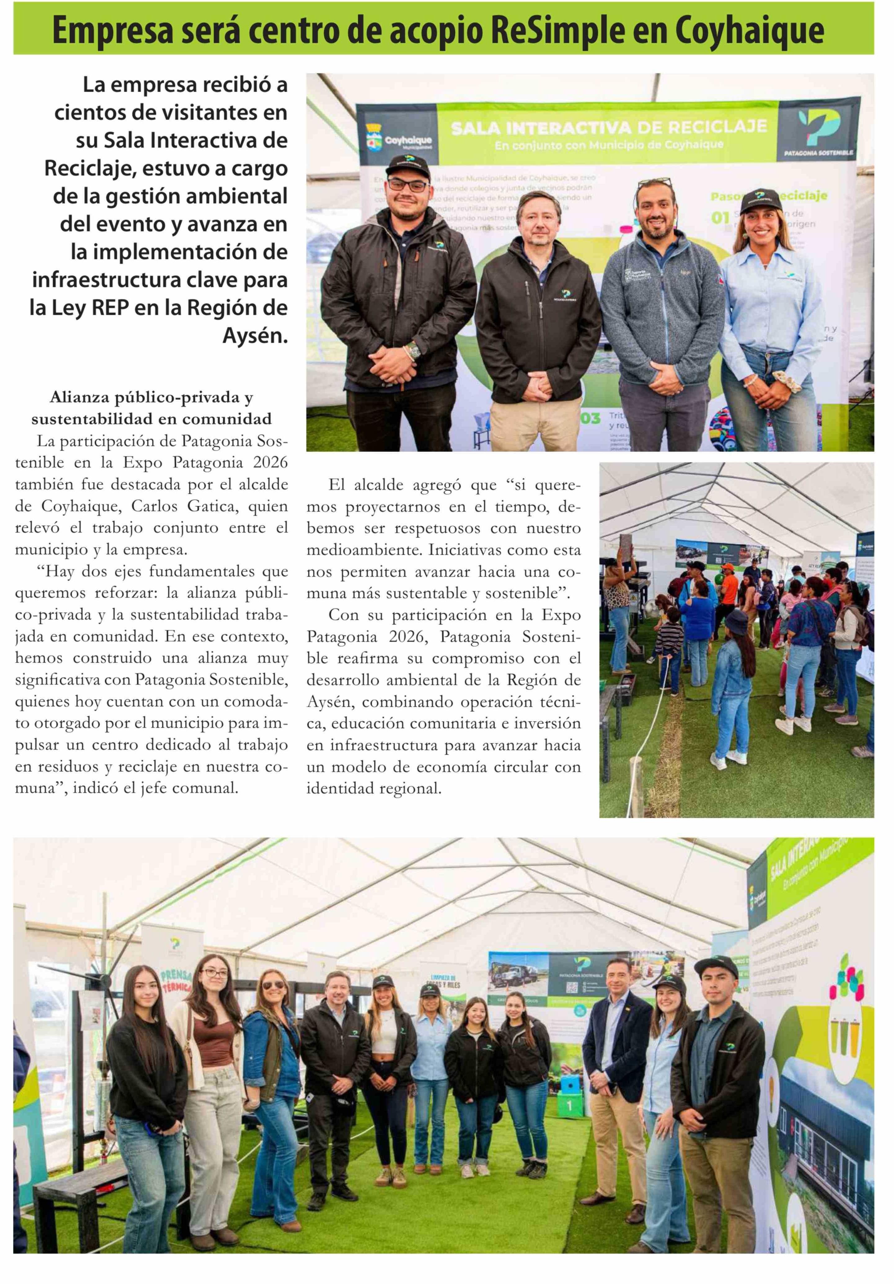 Título: Alianza público-privada y sustentabilidad en comunidad La participación de Patagonia Sostenible en la Expo Patagonia 2026 también fue destacada por el alcalde de Coyhaique, Carlos Gatica, quien relevó el trabajo conjunto entre el municipio y la empresa. "Hay dos ejes fundamentales que queremos refor