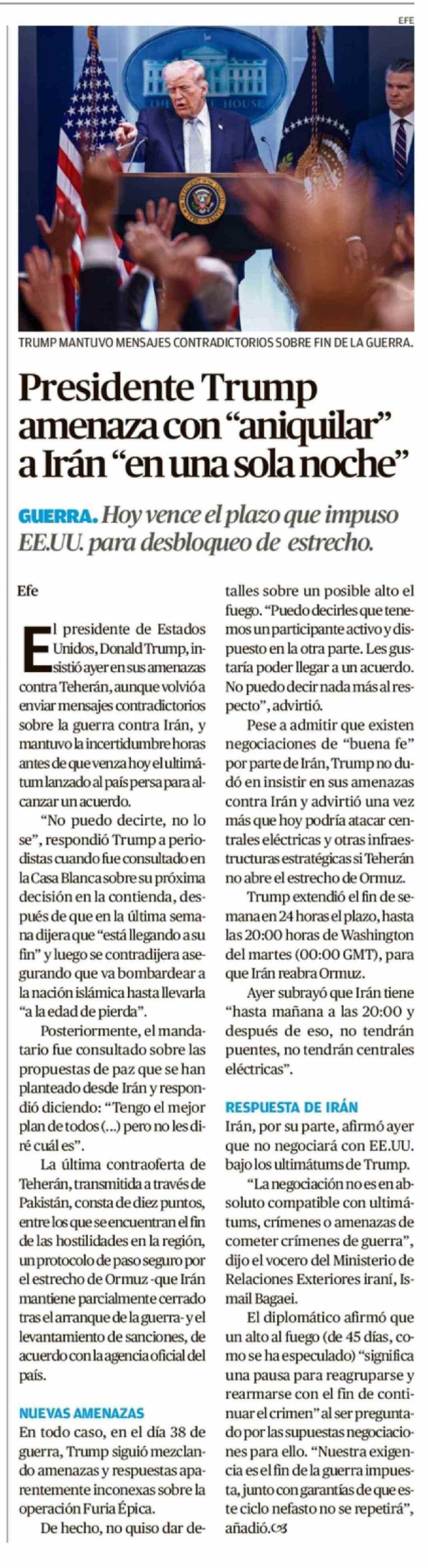 Presidente Trump amenaza con "aniquilar" a Irán "en una sola noche" 07-04-2026 Diario Austral Región de Los Ríos |