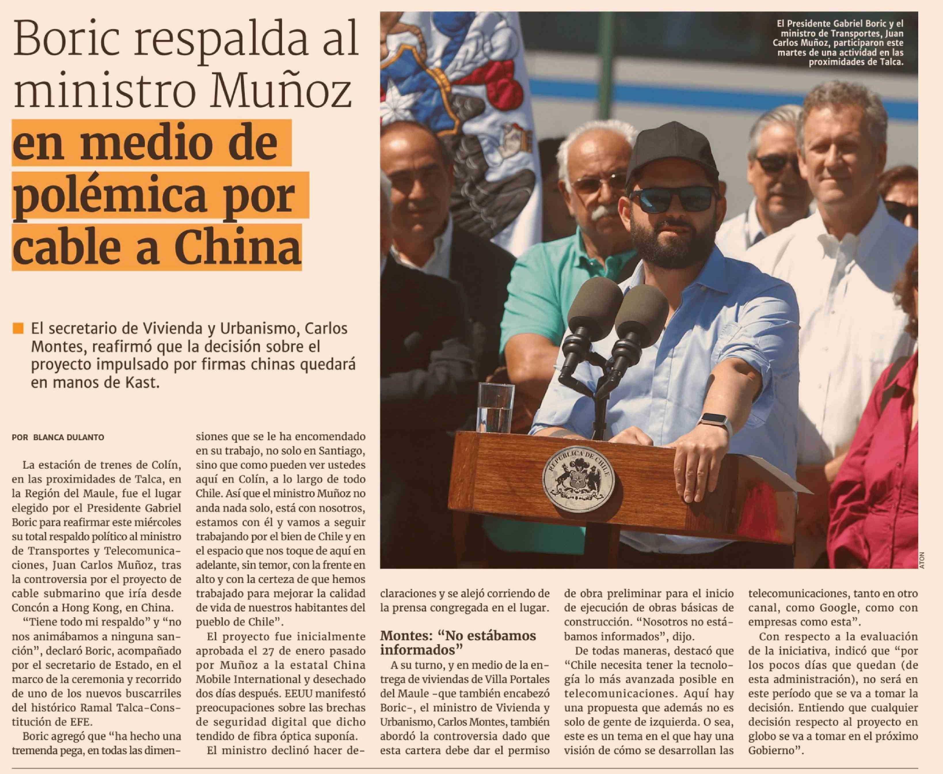 | Título: | Boric respalda al ministro Muñoz en medio de polémica por cable a China |