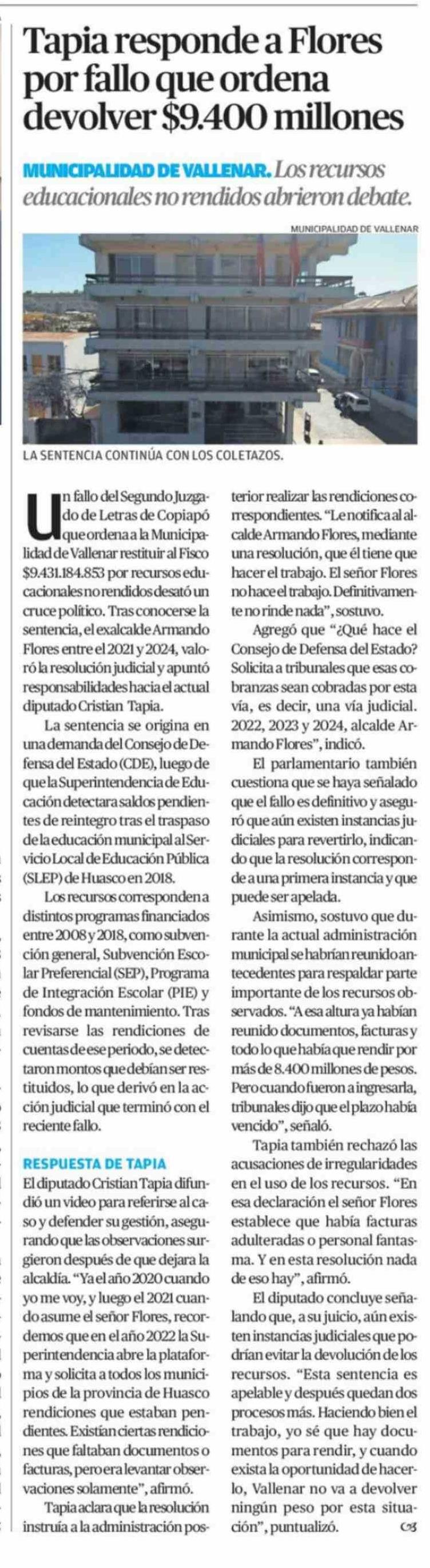 Título: Tapia responde a Flores por fallo que ordena devolver $9.400 millones