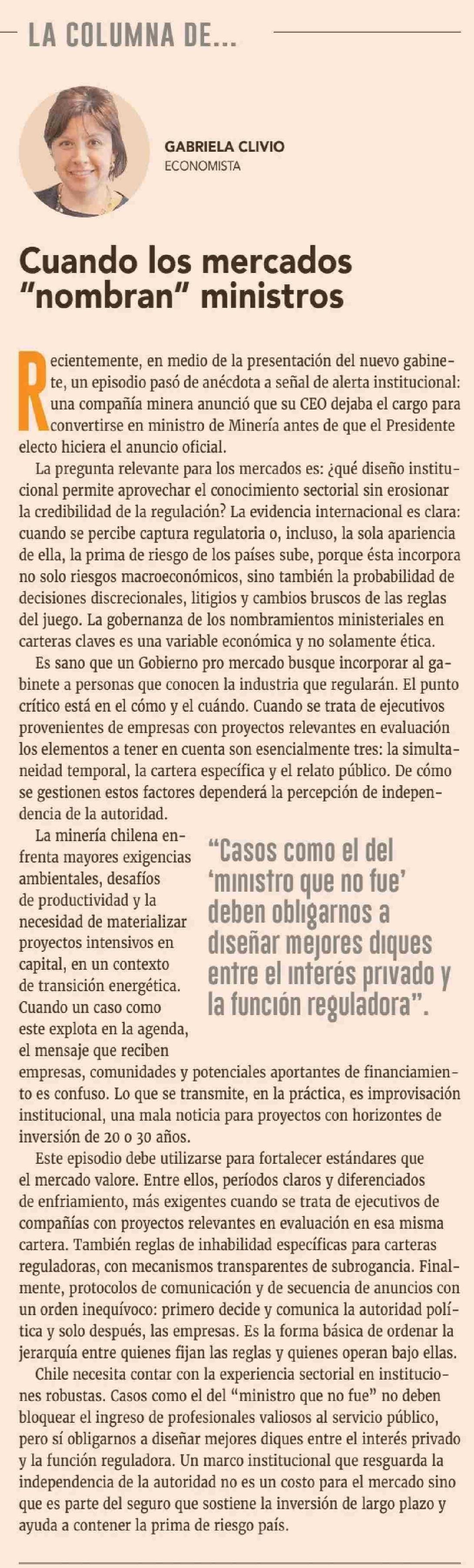 Columnas de Opinión: Cuando los mercados "nombran" ministros 28-01-2026 Diario Financiero |