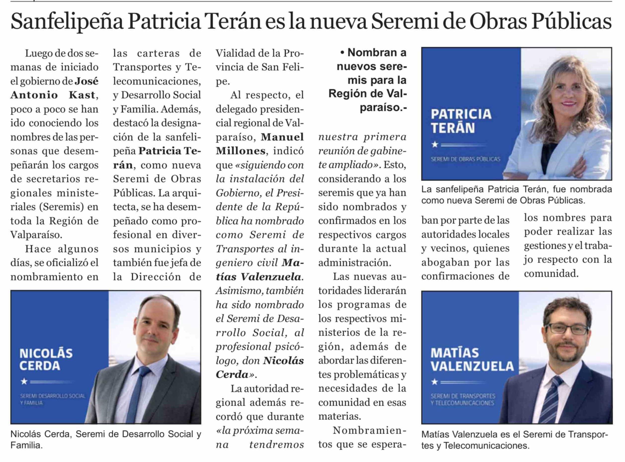 | Título: | Sanfelipeña Patricia Terán es la nueva Seremi de Obras Públicas |