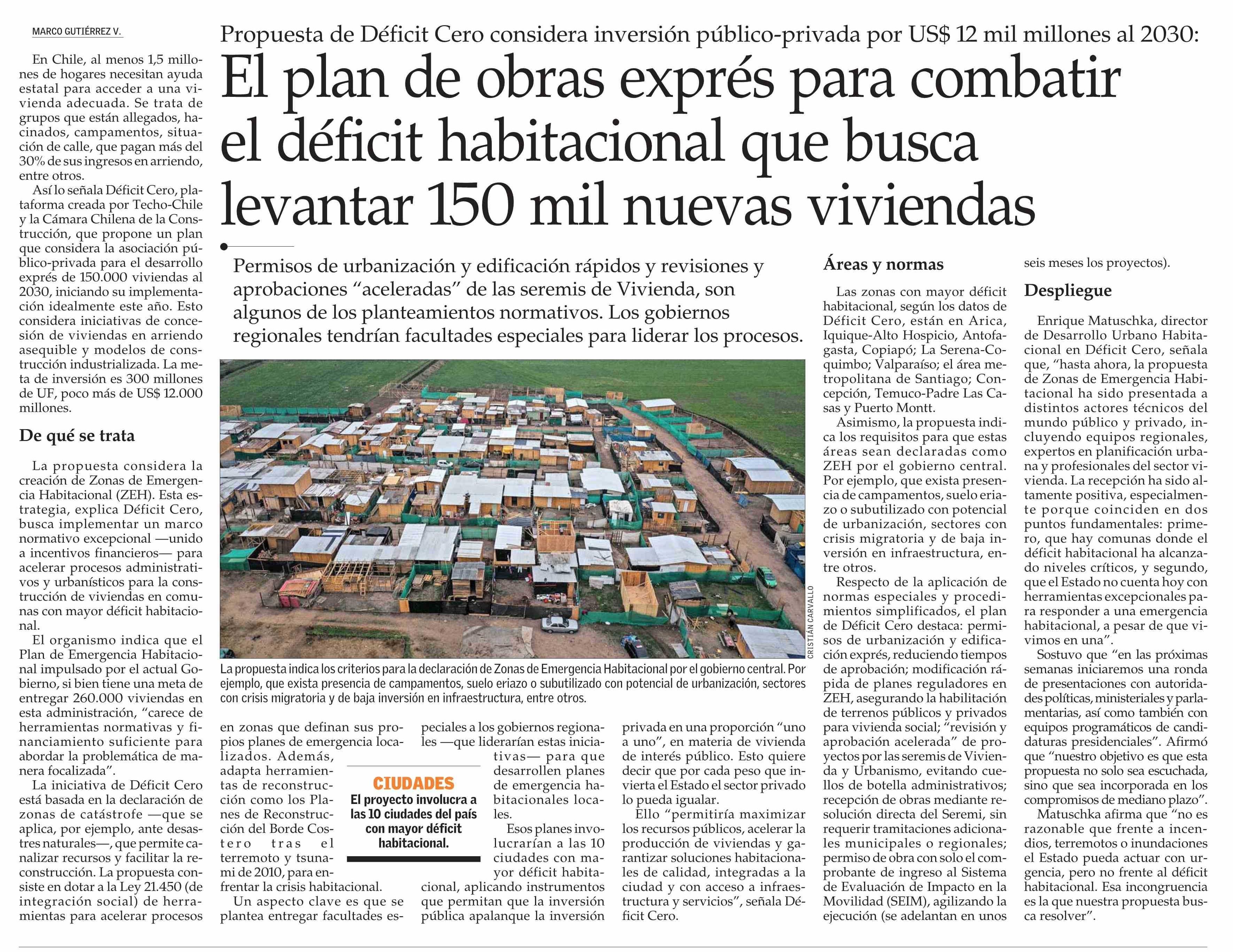 El plan de obras exprés para combatir el déficit habitacional que busca levantar 150 mil nuevas viviendas 22-04-2025 El Mercurio |