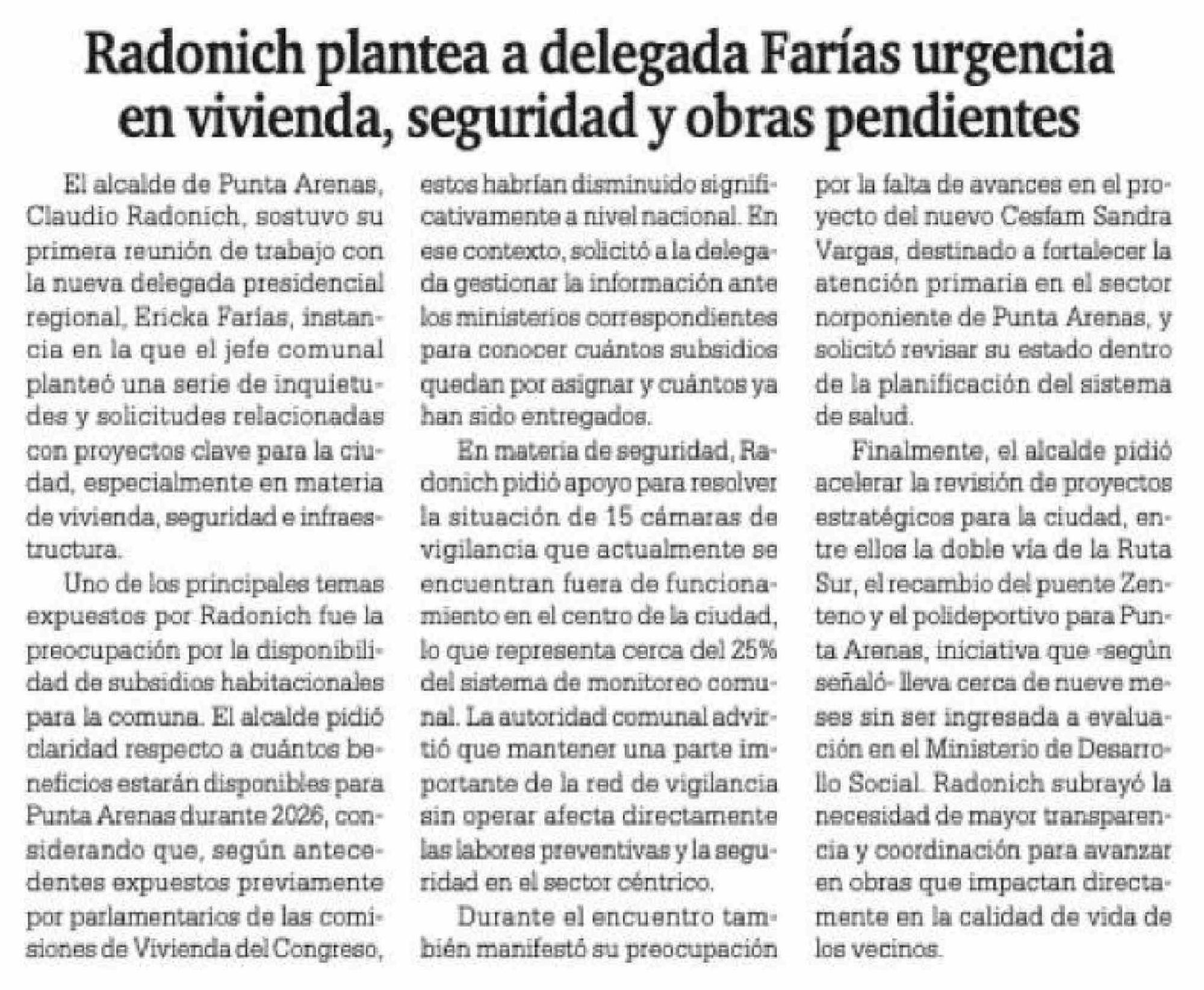 Radonich plantea a delegada Farías urgencia en vivienda, seguridad y obras pendientes 16-03-2026 La Prensa Austral |