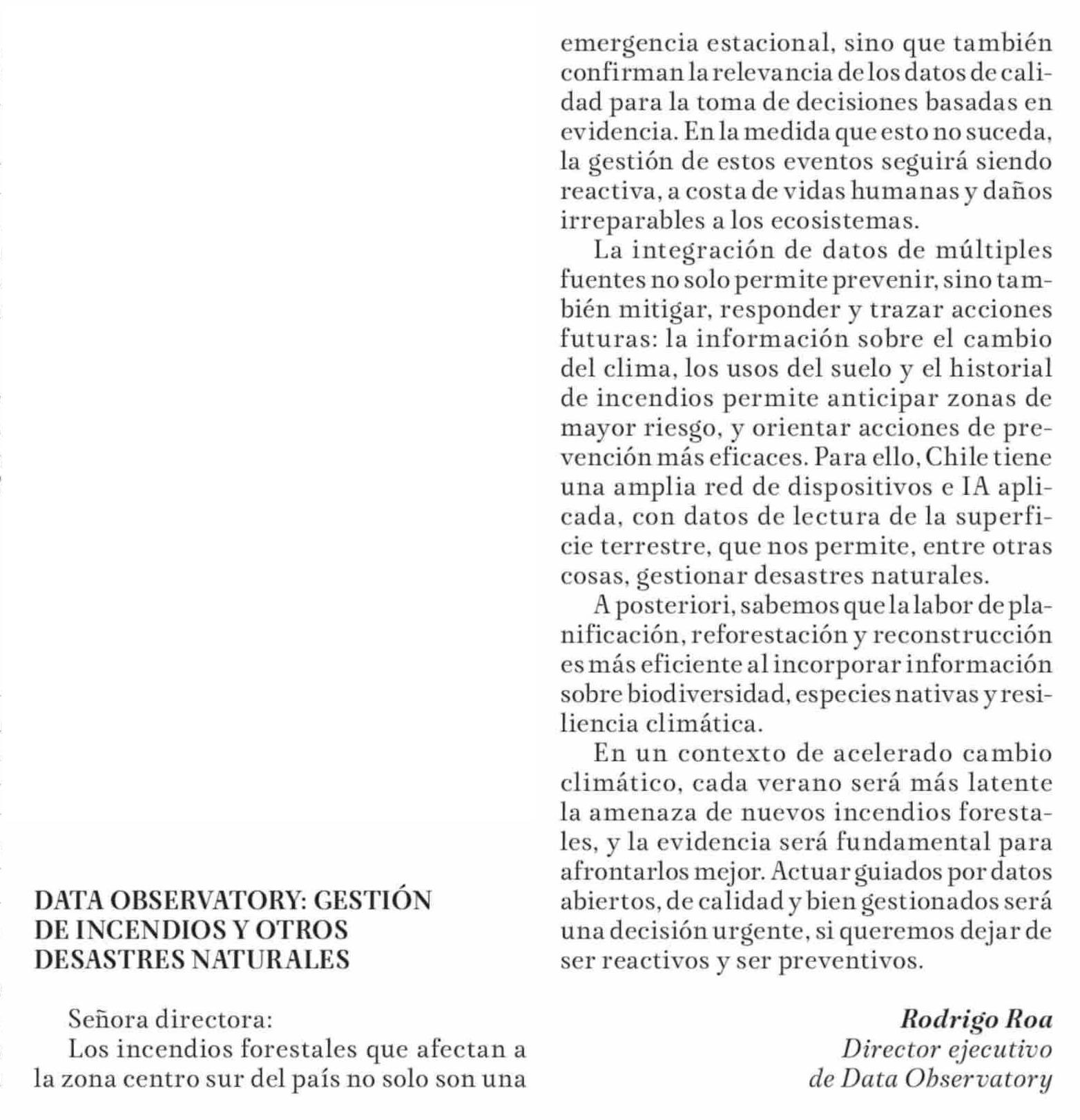Cartas: DATA OBSERVATORY: GESTIÓN DE INCENDIOS Y OTROS DESASTRES NATURALES 23-01-2026 La Tribuna |