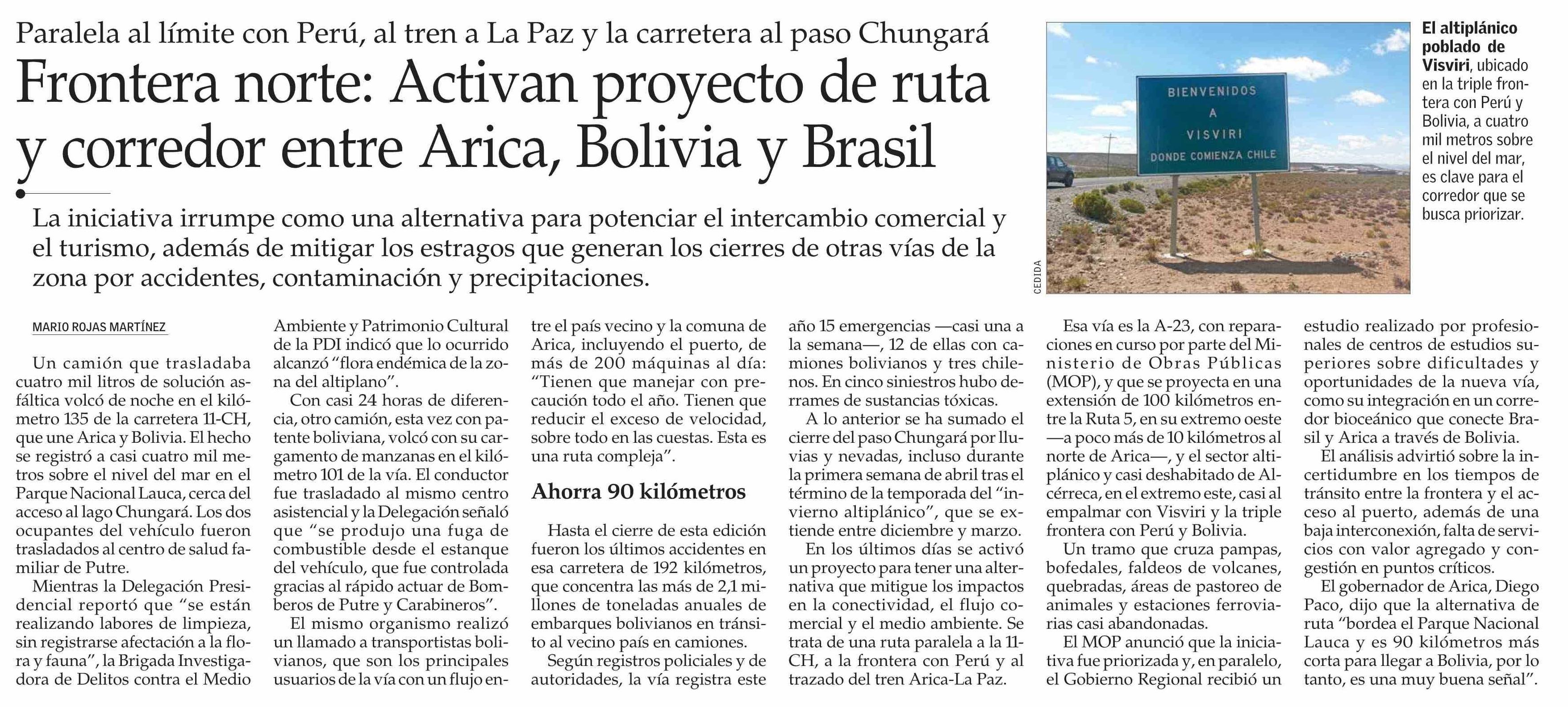 Frontera norte: Activan proyecto de ruta y corredor entre Arica, Bolivia y Brasil 26-04-2026 El Mercurio |