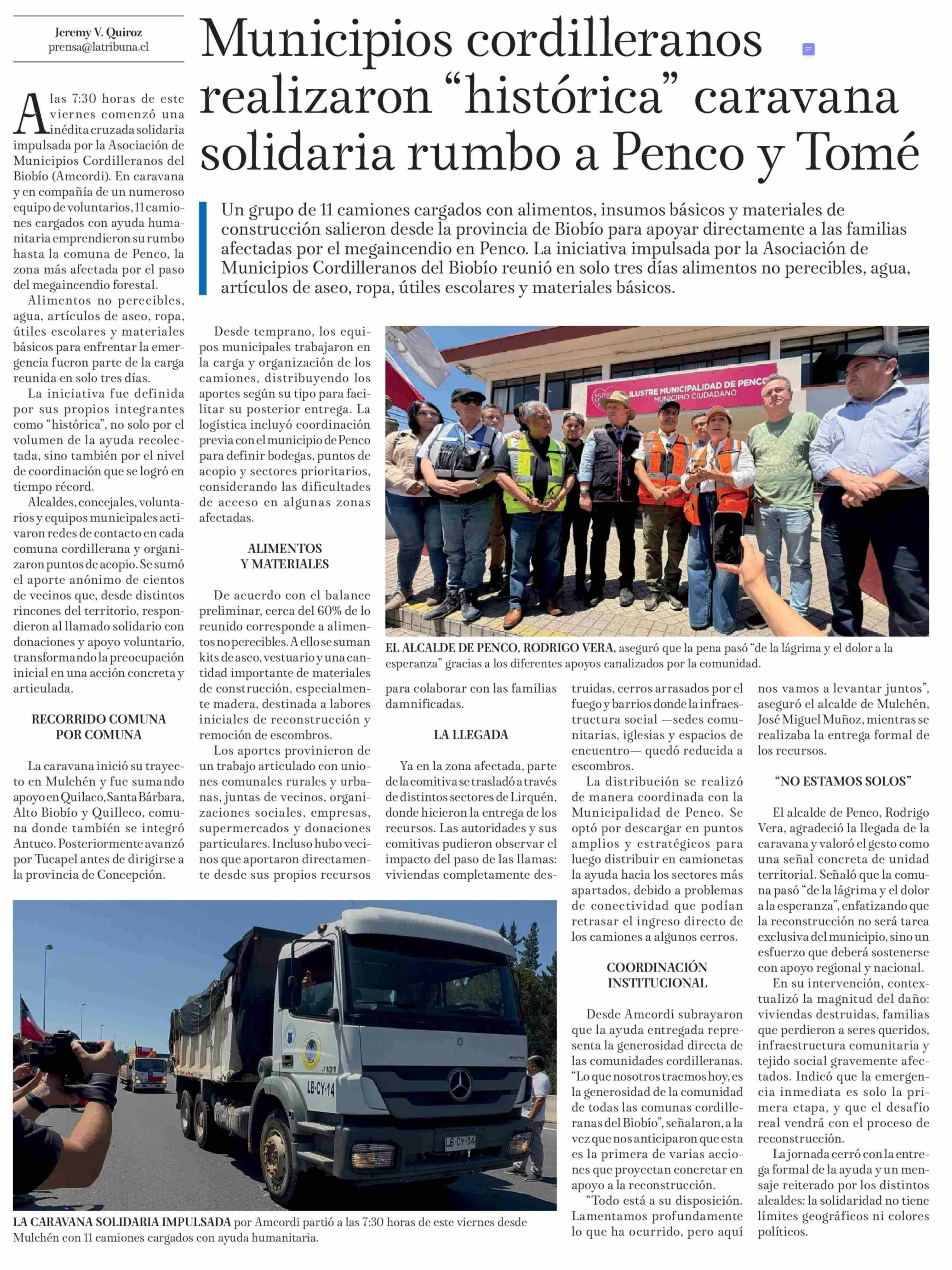 Municipios cordilleranos realizaron "histórica" caravana solidaria rumbo a Penco y Tomé 27-01-2026 La Tribuna |