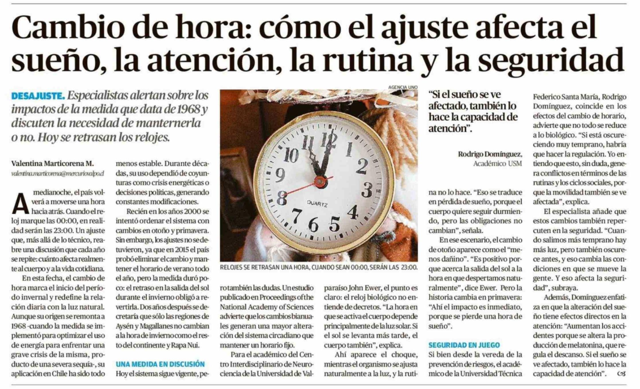 Cambio de hora: cómo el ajuste afecta el sueño, la atención, la rutina y la seguridad 04-04-2026 El Mercurio de Valparaíso |