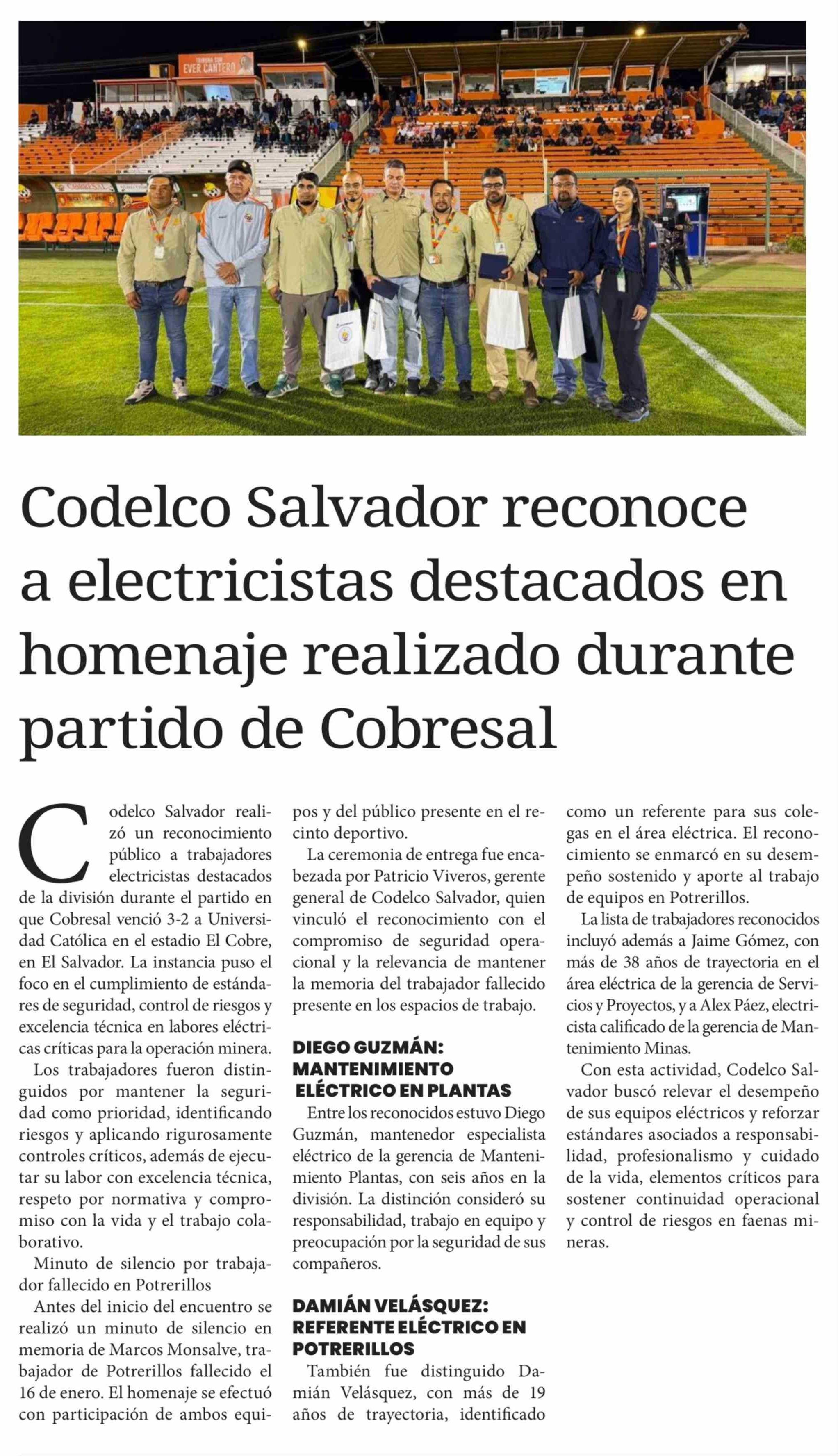 Título: Codelco Salvador reconoce a electricistas destacados en homenaje realizado durante partido de Cobresal