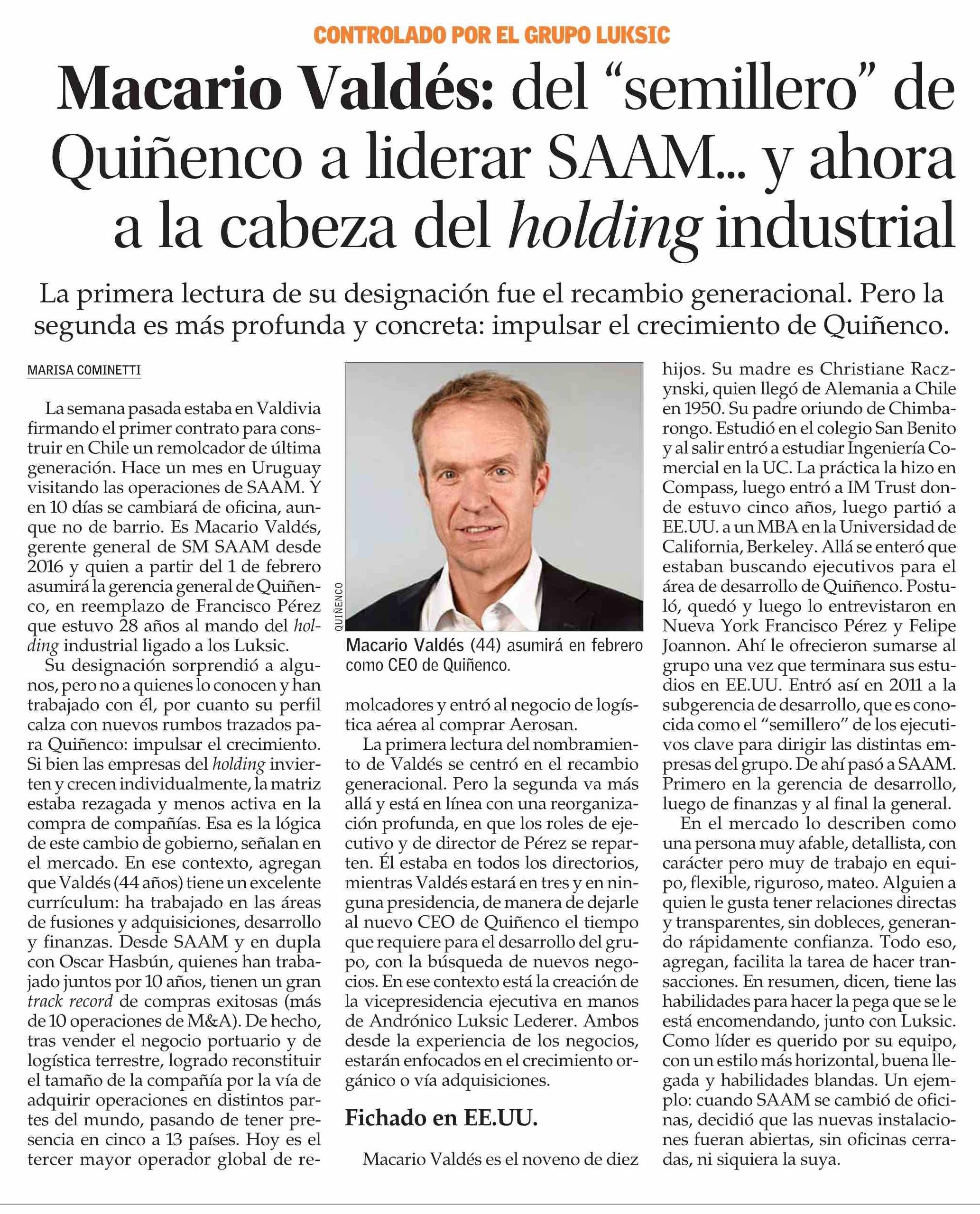 | Título: | Macario Valdés: del "semillero" de Quiñenco a liderar SAAM... y ahora a la cabeza del holding industrial |