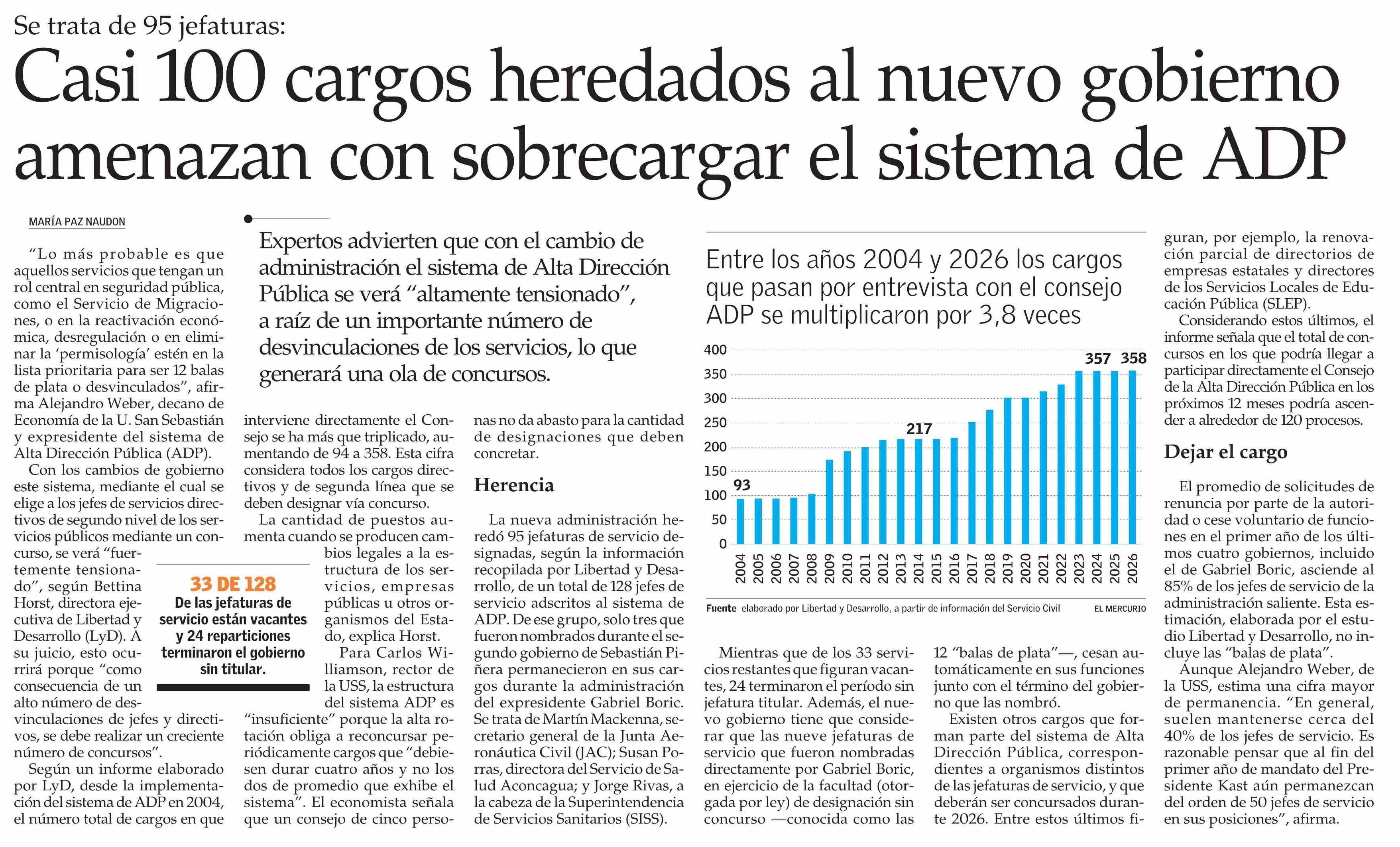 Casi 100 cargos heredados al nuevo gobierno amenazan con sobrecargar el sistema de ADP 12-03-2026 El Mercurio |