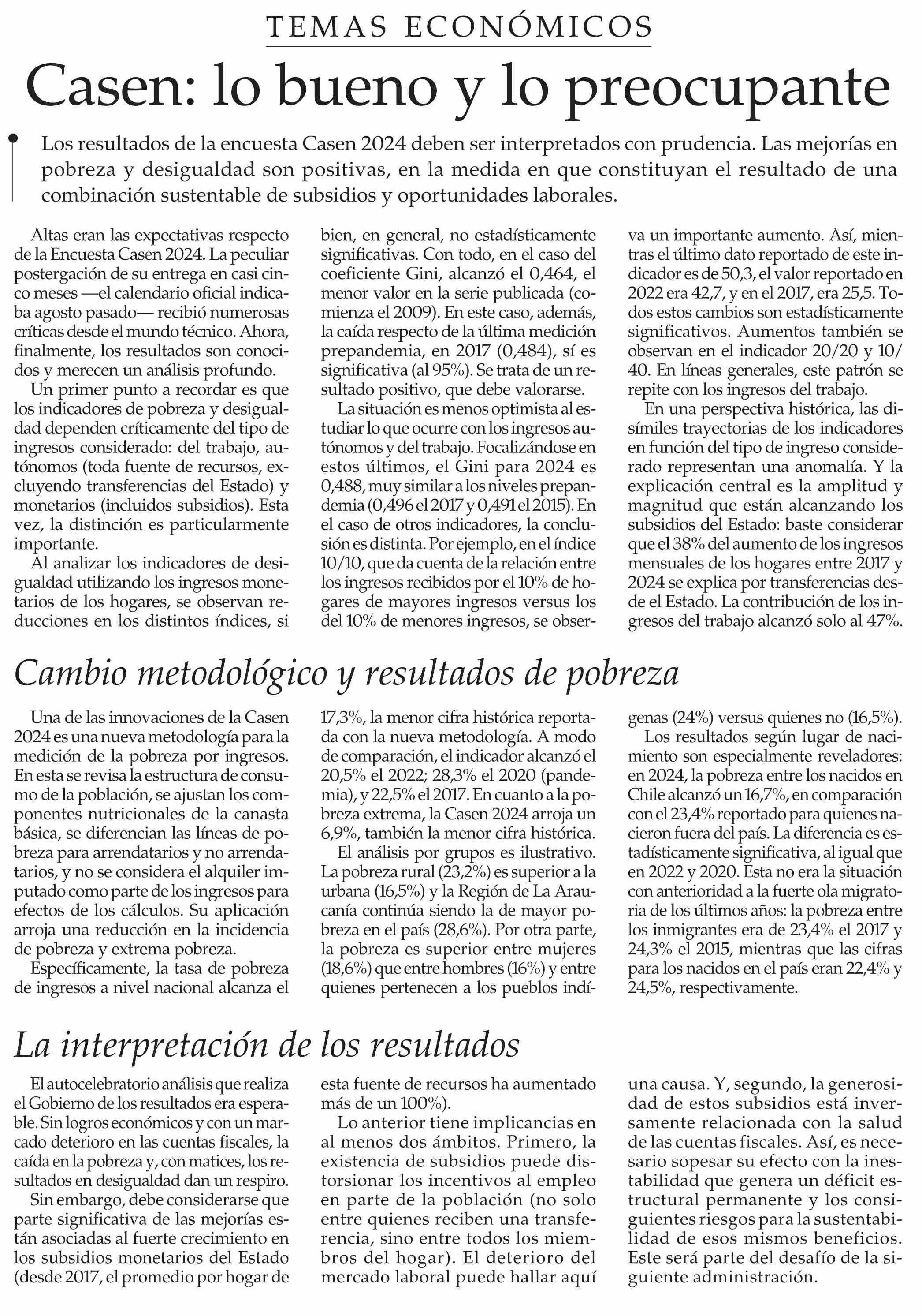 Editorial: Casen: lo bueno y lo preocupante 10-01-2026 El Mercurio |