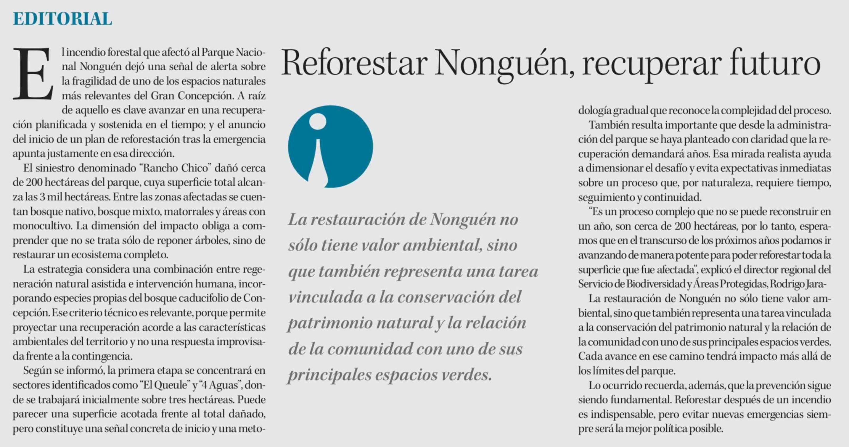 Editorial: Reforestar Nonguén, recuperar futuro 28-04-2026 Diario Concepción |