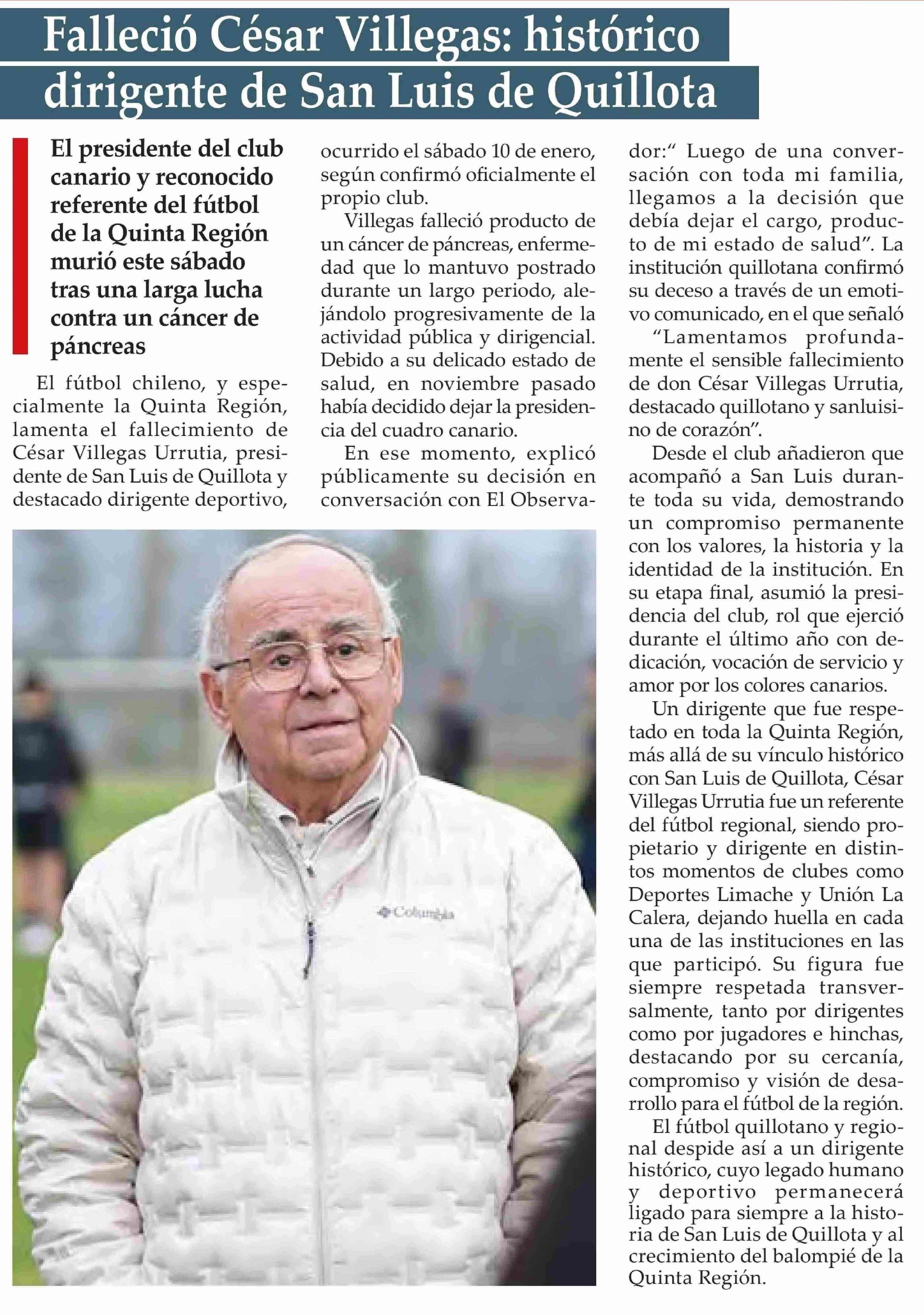 Falleció César Villegas: histórico dirigente de San Luis de Quillota 12-01-2026 El Observador Vespertino |