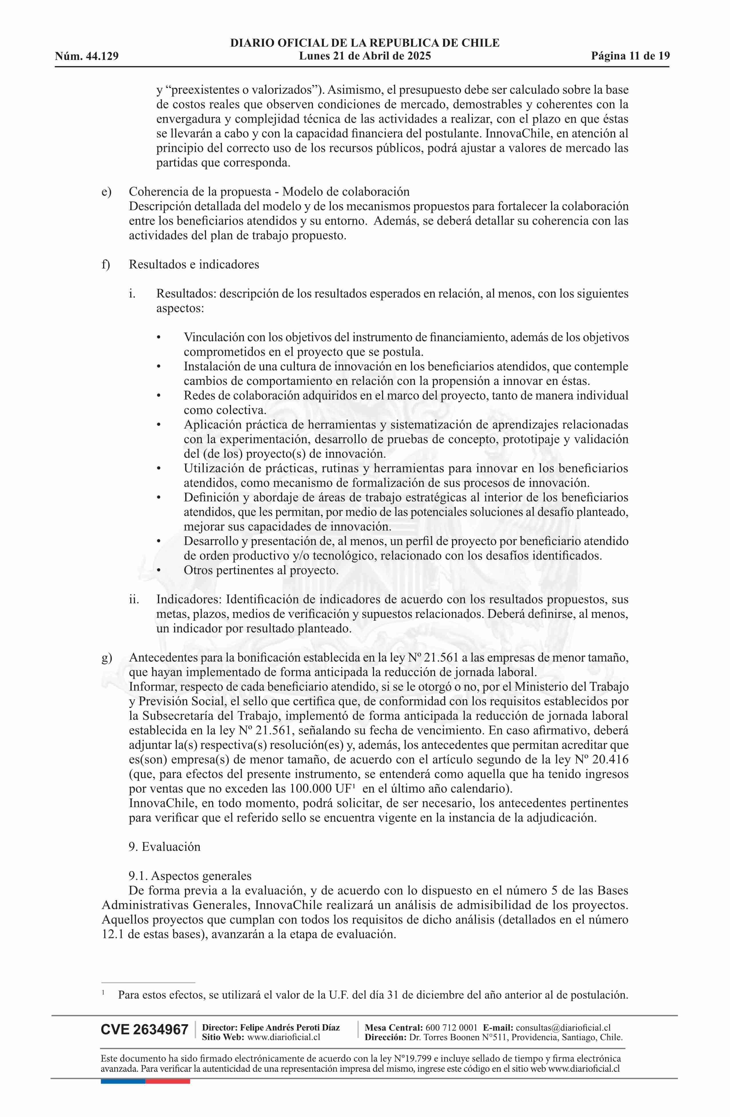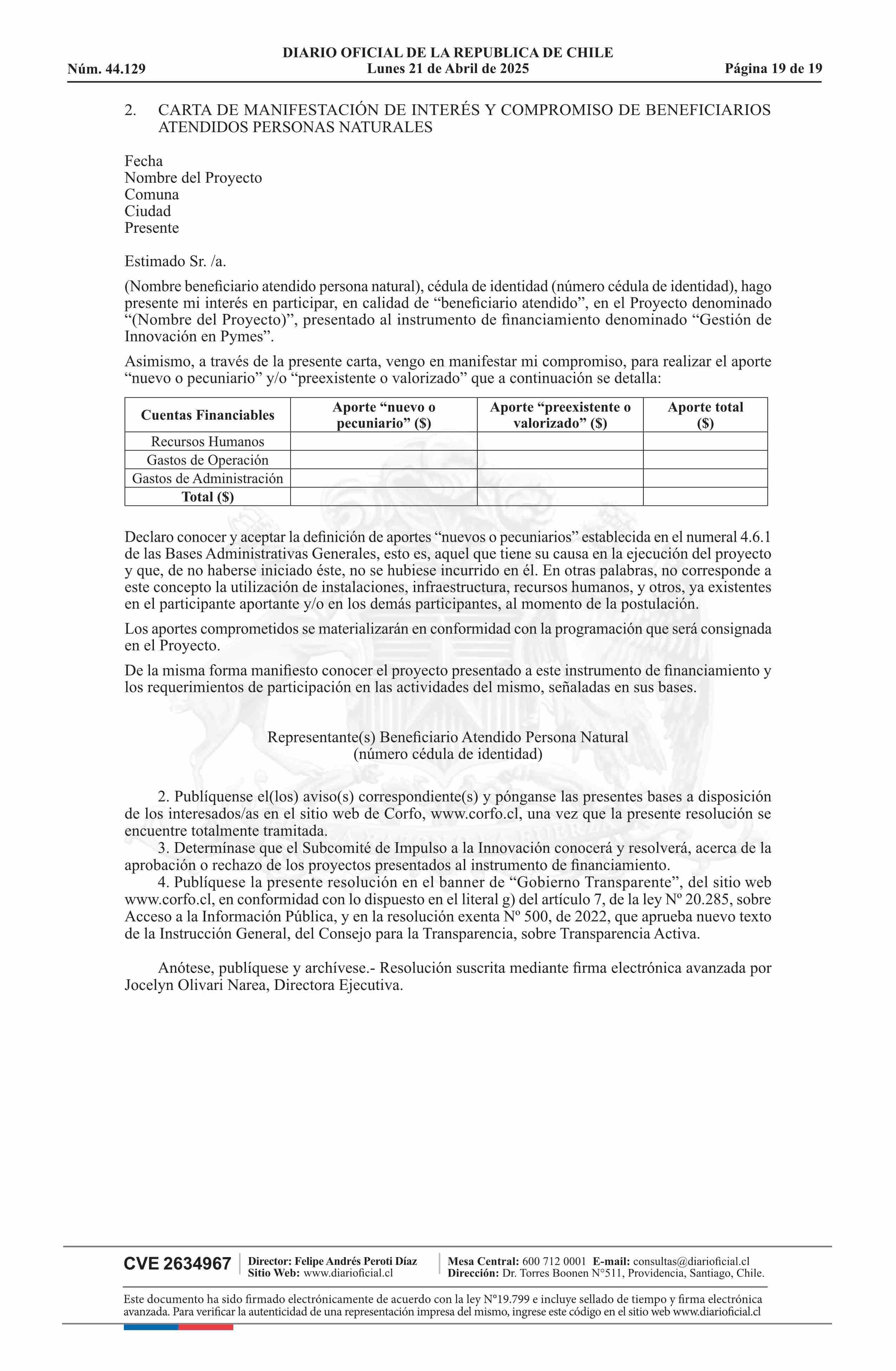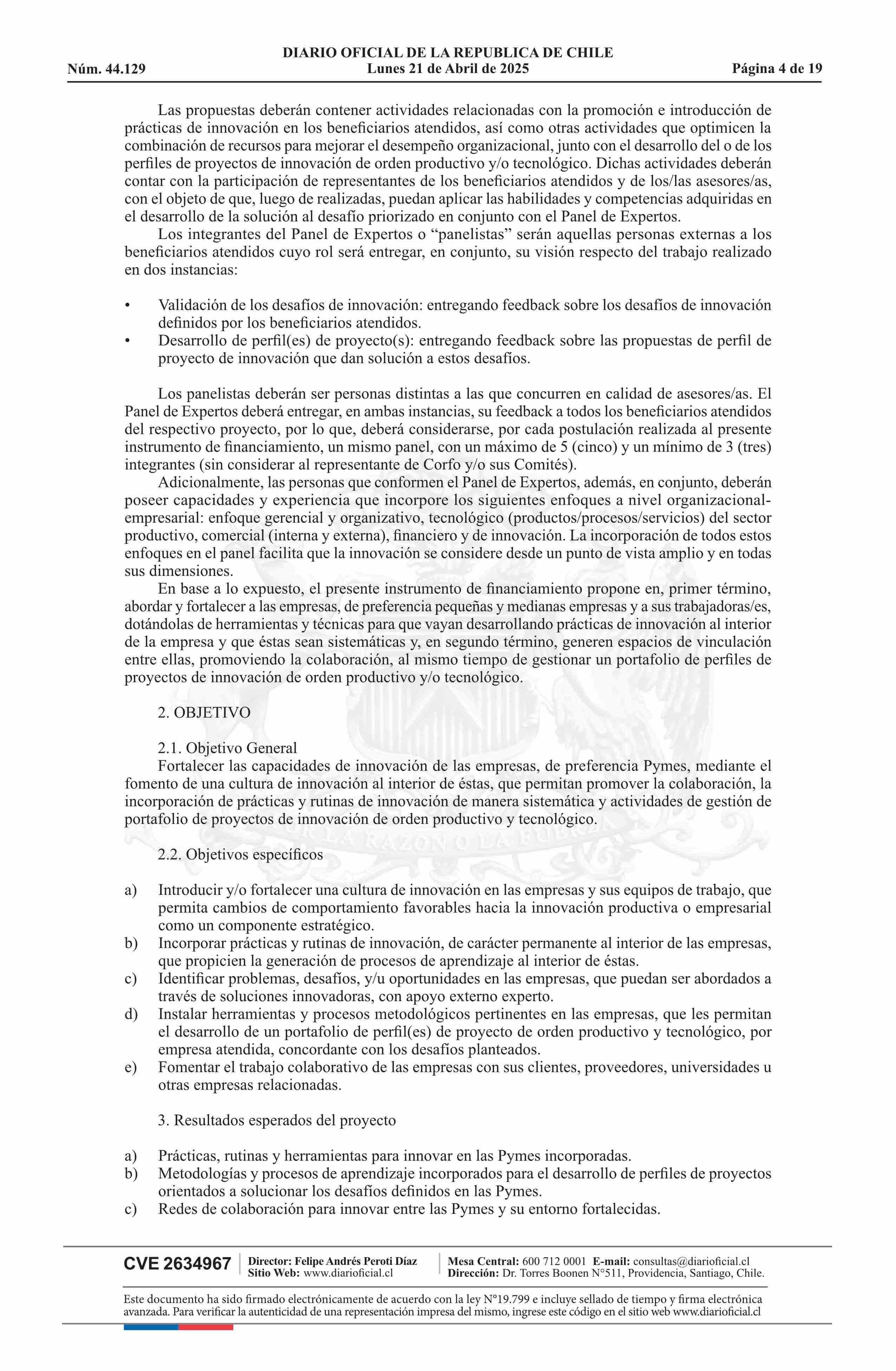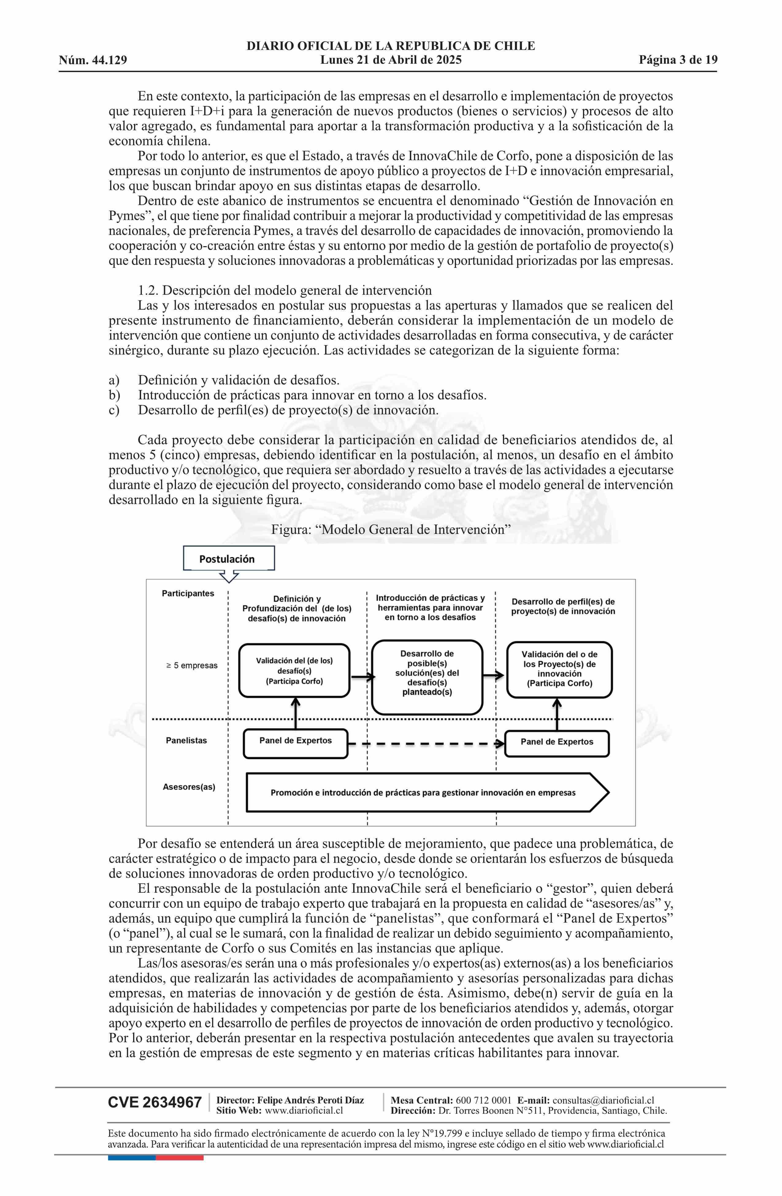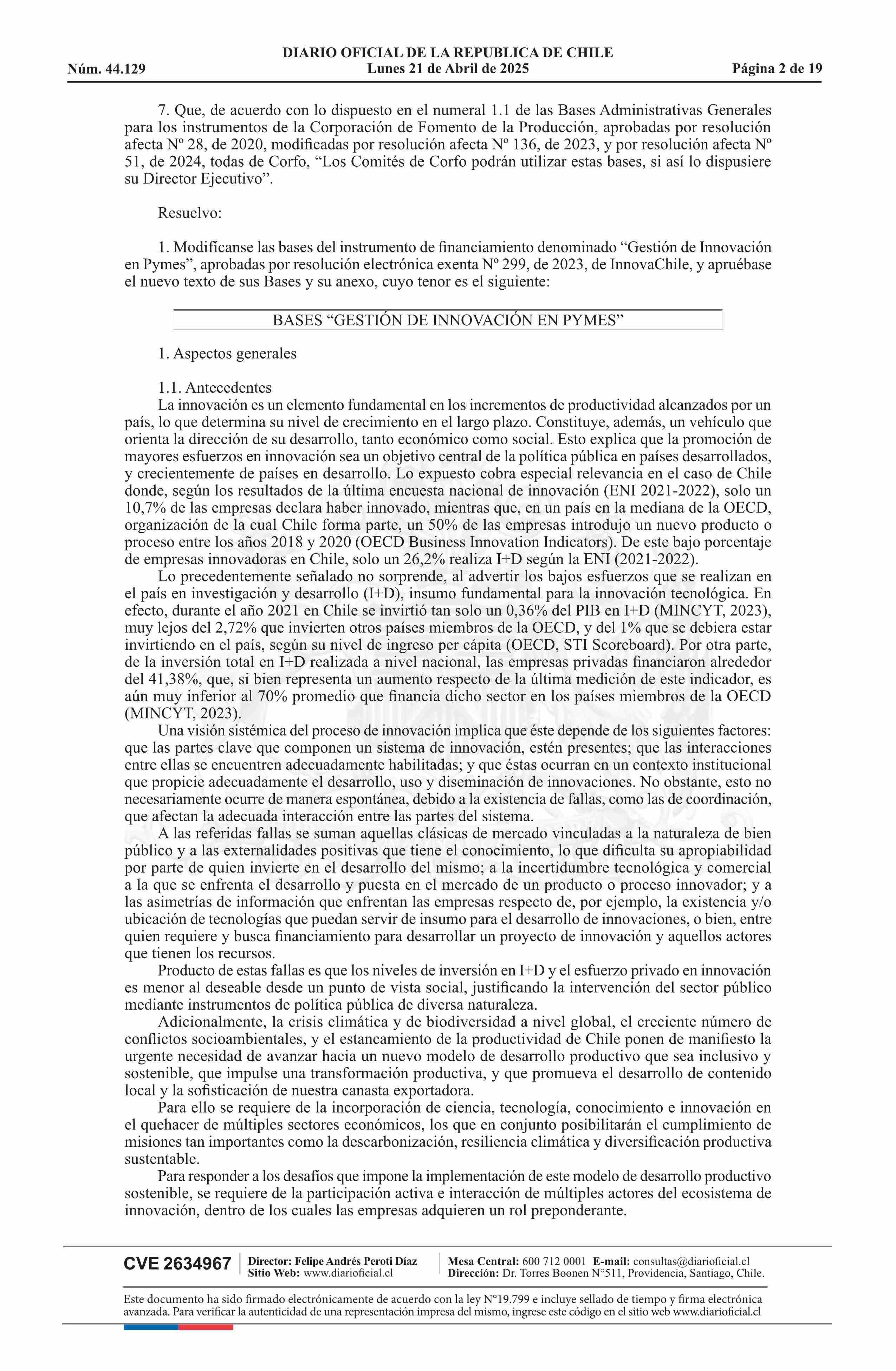 Resolución exenta número 125, de 2025.- Modifica instrumento de financiamiento denominado Gestión de Innovación en Pymes y aprueba nuevo texto de sus bases y su anexo 21-04-2025 DIARIO OFICIAL CHILE - BOLETÍN OFICIAL DE MINERÍA |