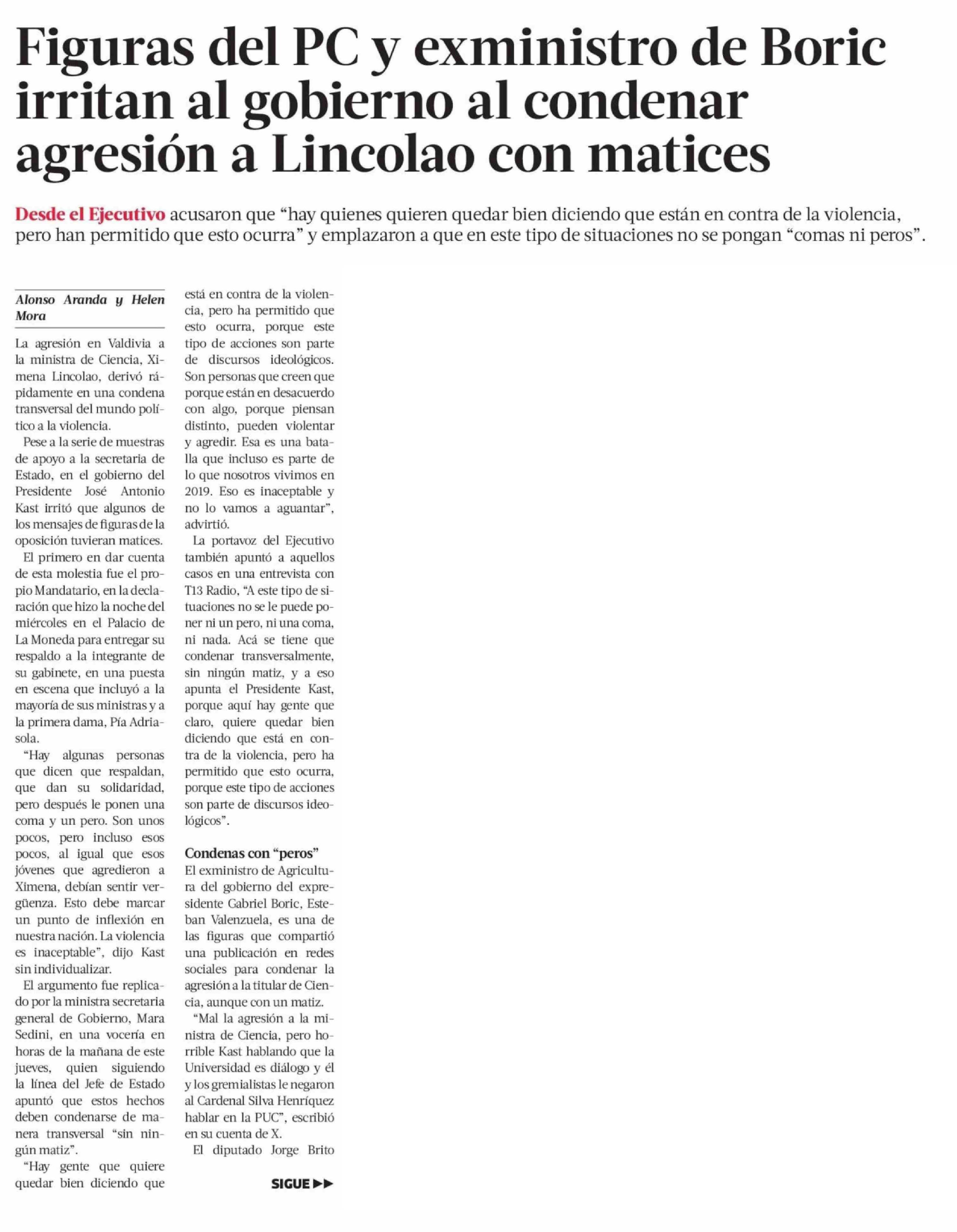 Figuras del PC y exministro de Boric irritan al gobierno al condenar agresión a Lincolao con matices 10-04-2026 La Tercera |