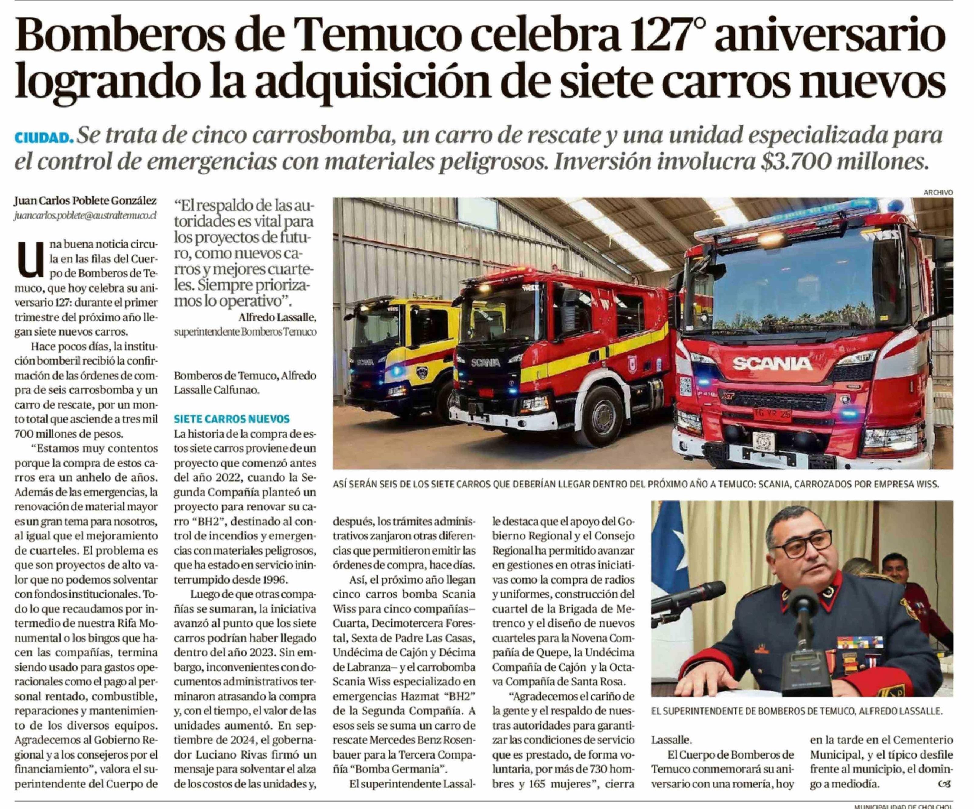 | Título: | Bomberos de Temuco celebra 127º aniversario logrando la adquisición de siete carros nuevos |