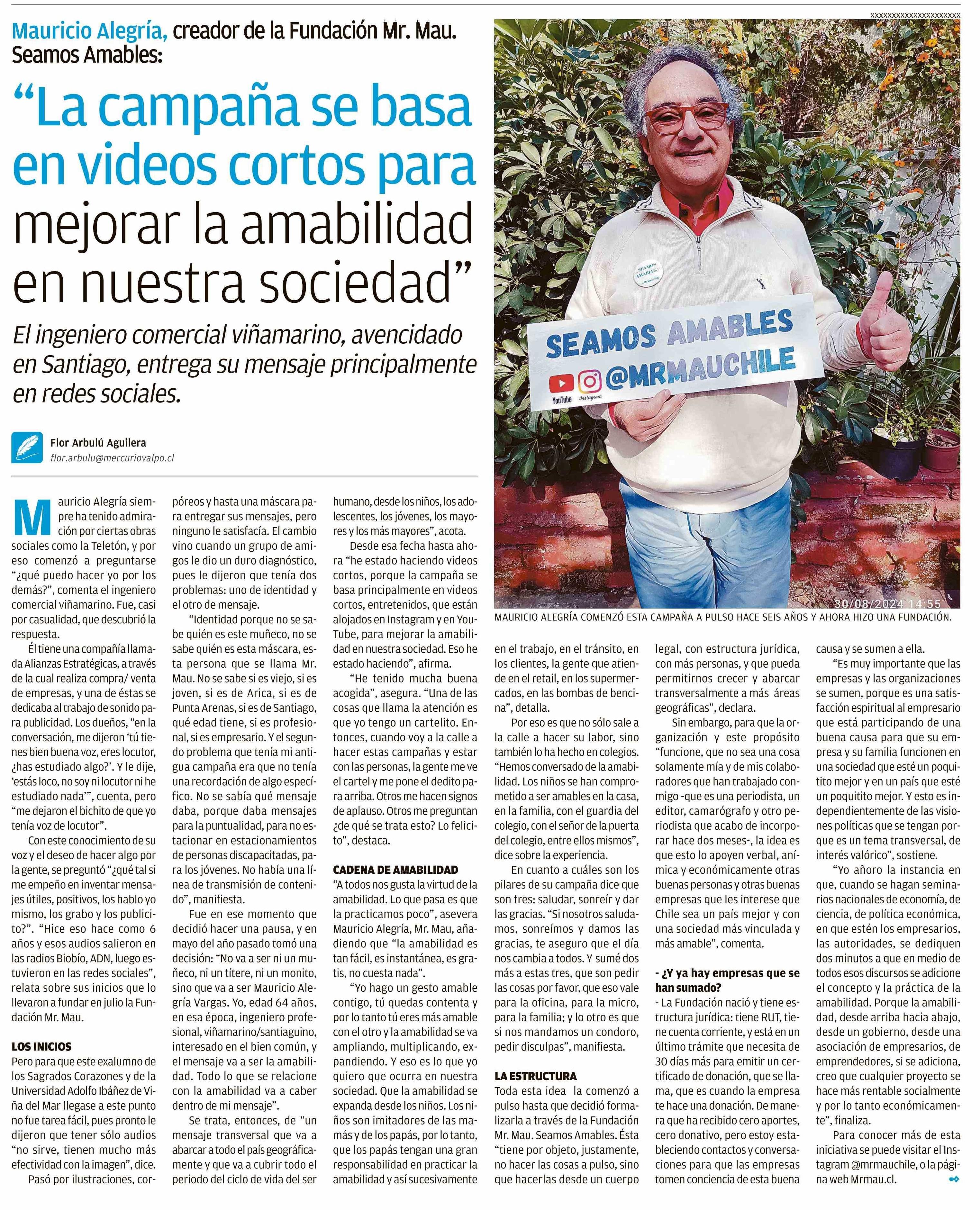 “La campaña se basa en videos cortos para mejorar la amabilidad en nuestra sociedad” 08-09-2024 El Mercurio de Valparaíso |