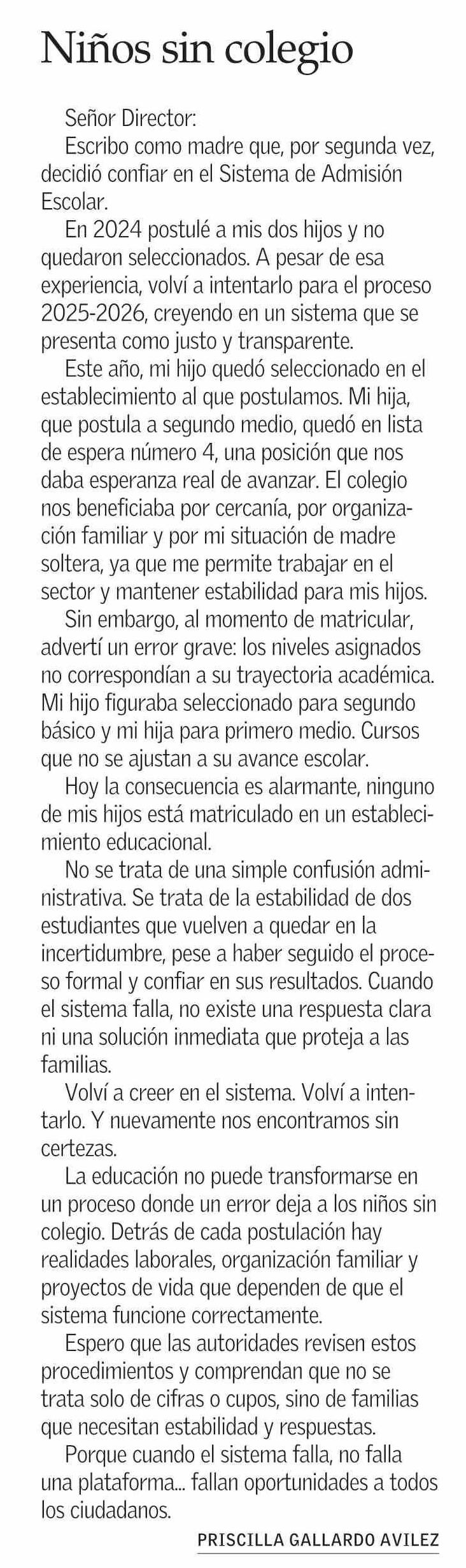 CARTAS: Niños sin colegio 01-03-2026 El Mercurio |