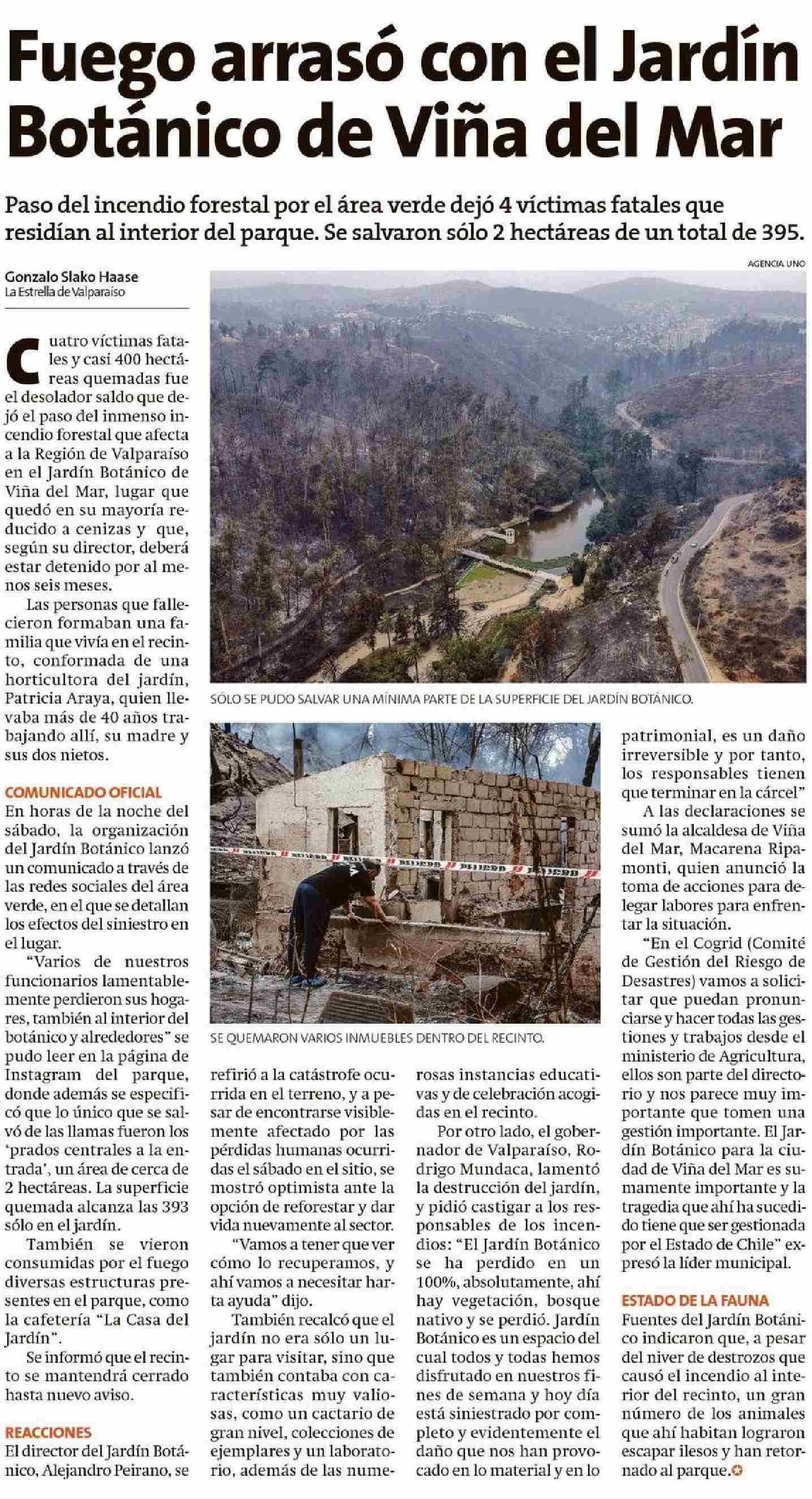 Fuego arrasó con el Jardín Botánico de Viña del Mar 05-02-2024 La Estrella de Valparaíso |