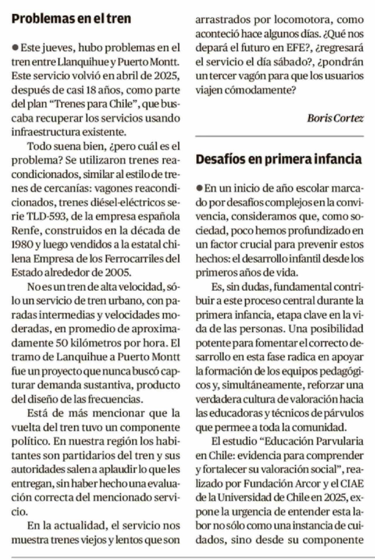 Cartas: Problemas en el tren 17-04-2026 El Llanquihue |