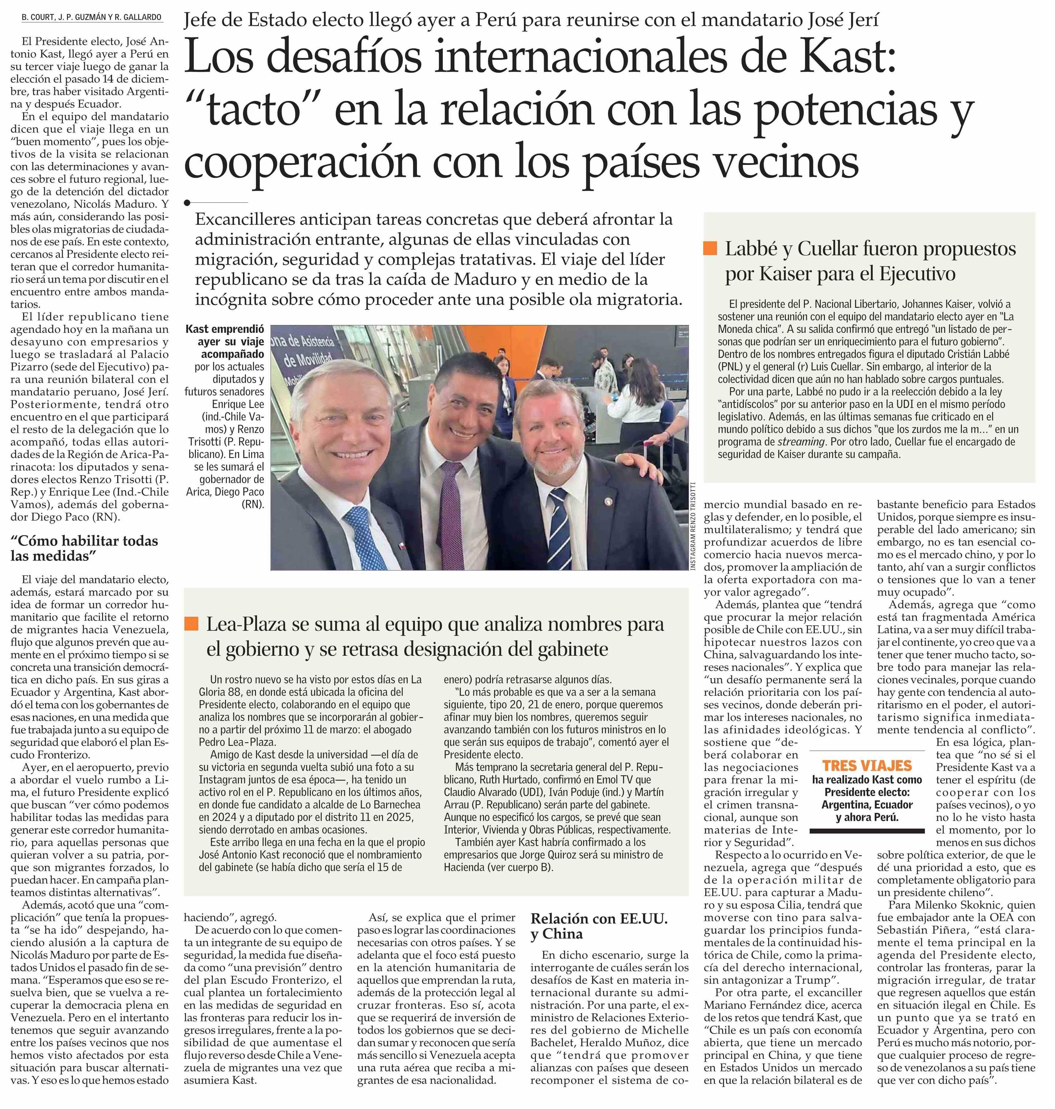Los desafíos internacionales de Kast: “tacto” en la relación con las potencias y cooperación con los países vecinos 07-01-2026 El Mercurio |