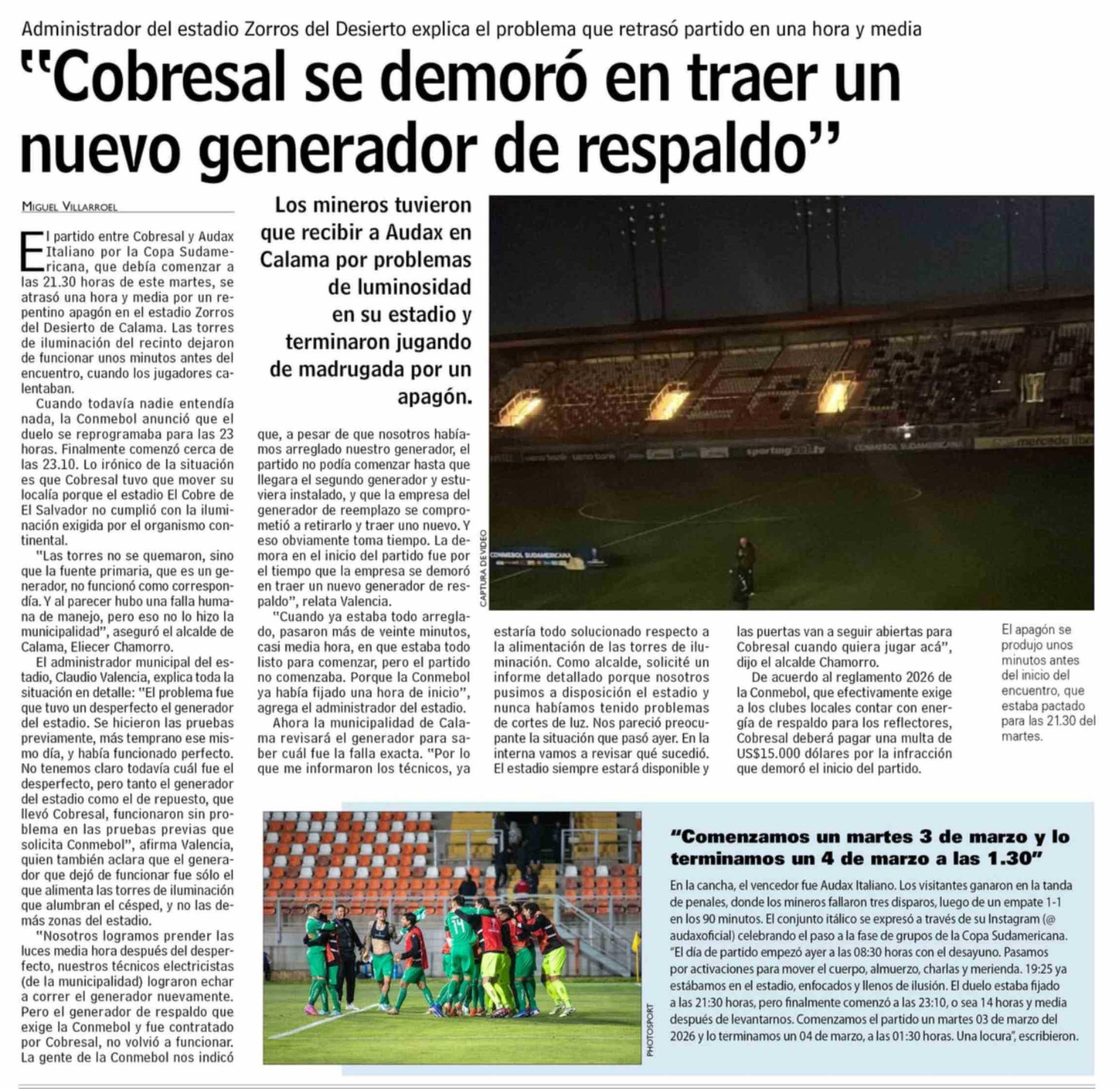 "Cobresal se demoró en traer un nuevo generador de respaldo" 05-03-2026 Las Últimas Noticias |