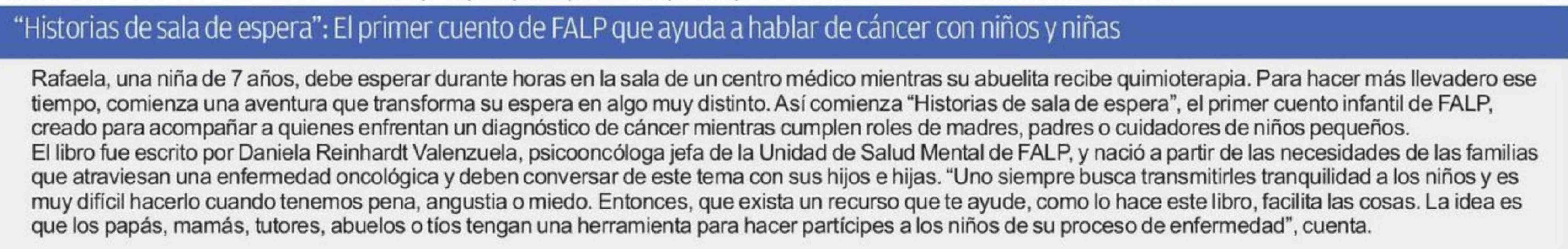 | Título: | "Historias de sala de espera": El primer cuento de FALP que ayuda a hablar de cáncer con niños y niñas |