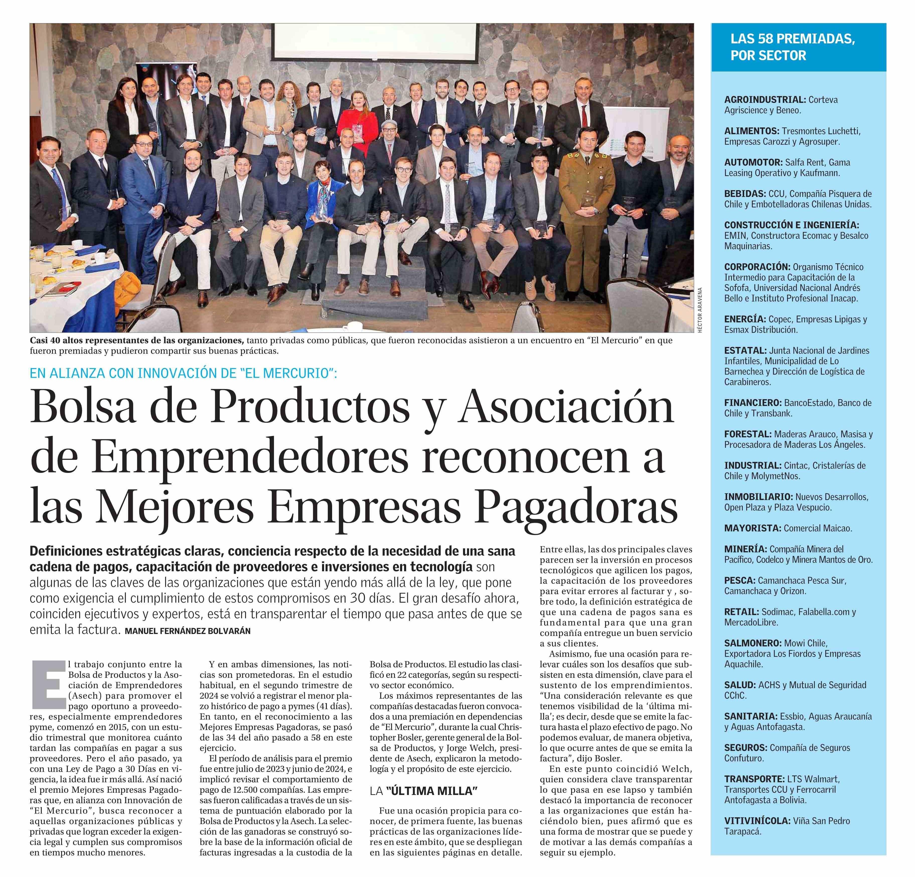 Bolsa de Productos y Asociación de Emprendedores reconocen a las Mejores Empresas Pagadoras 08-08-2024 El Mercurio |
