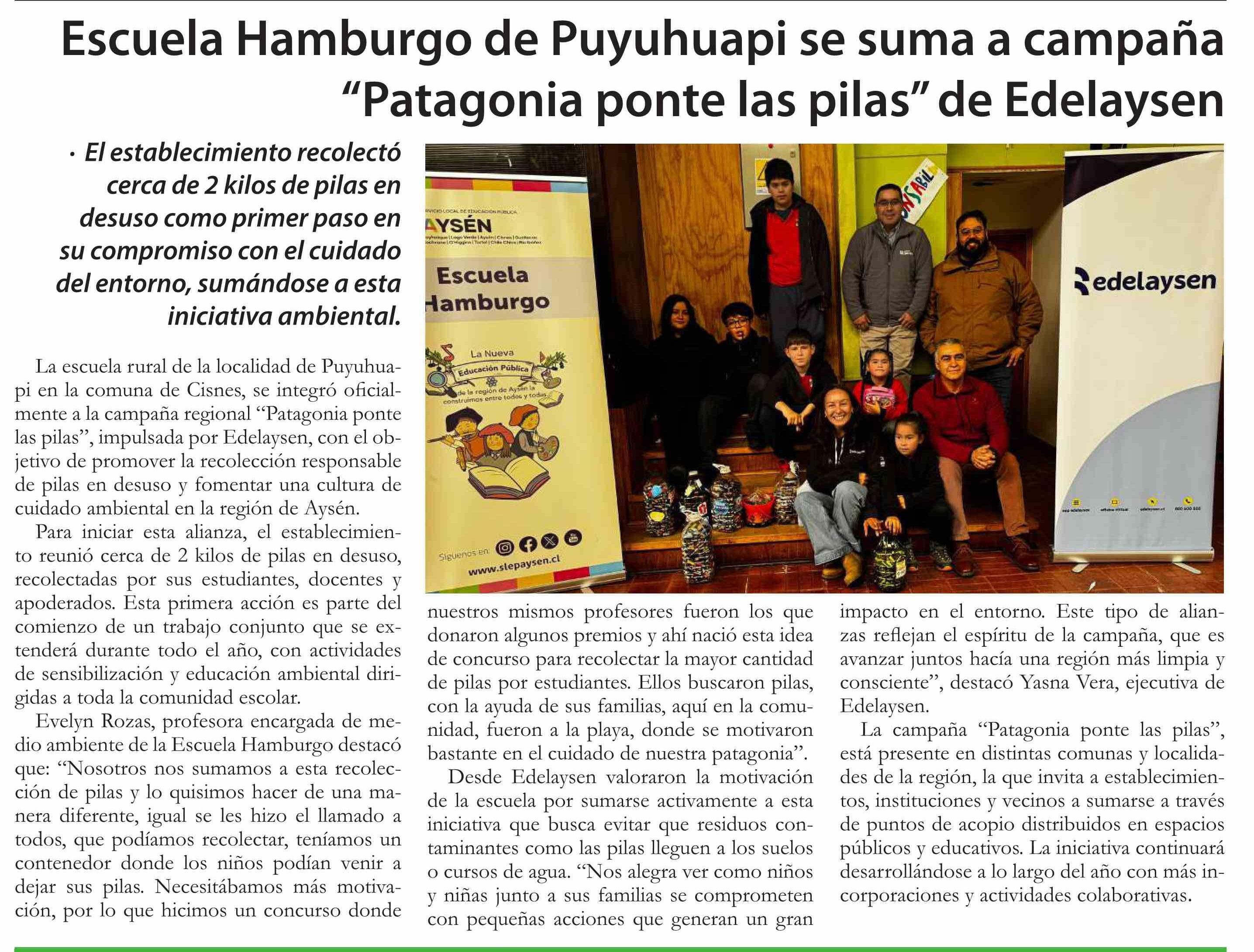 | Título: | Escuela Hamburgo de Puyuhuapi se suma a campaña “Patagonia ponte las pilas” de Edelaysen |