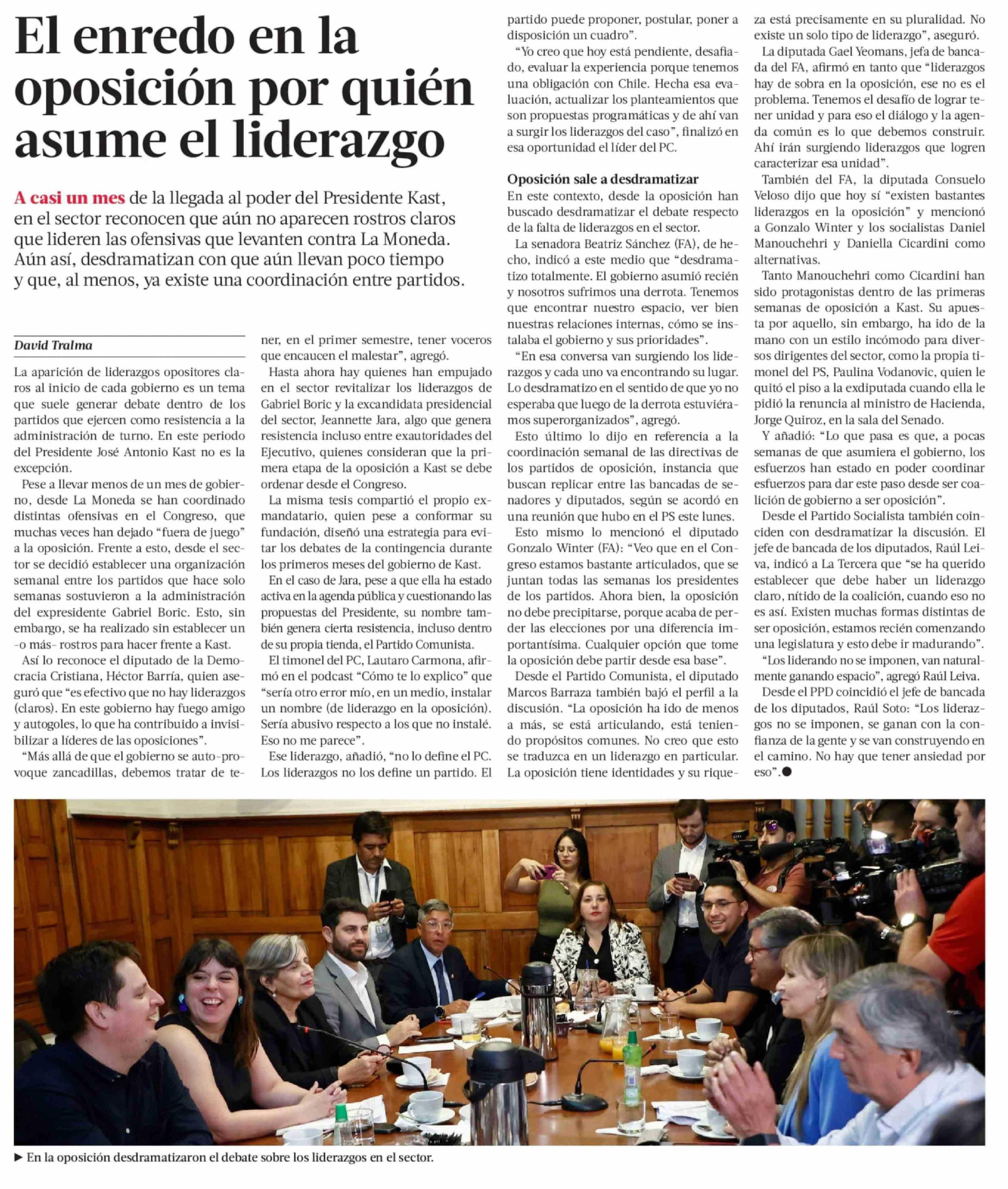 El enredo en la oposición por quién asume el liderazgo 08-04-2026 La Tercera |