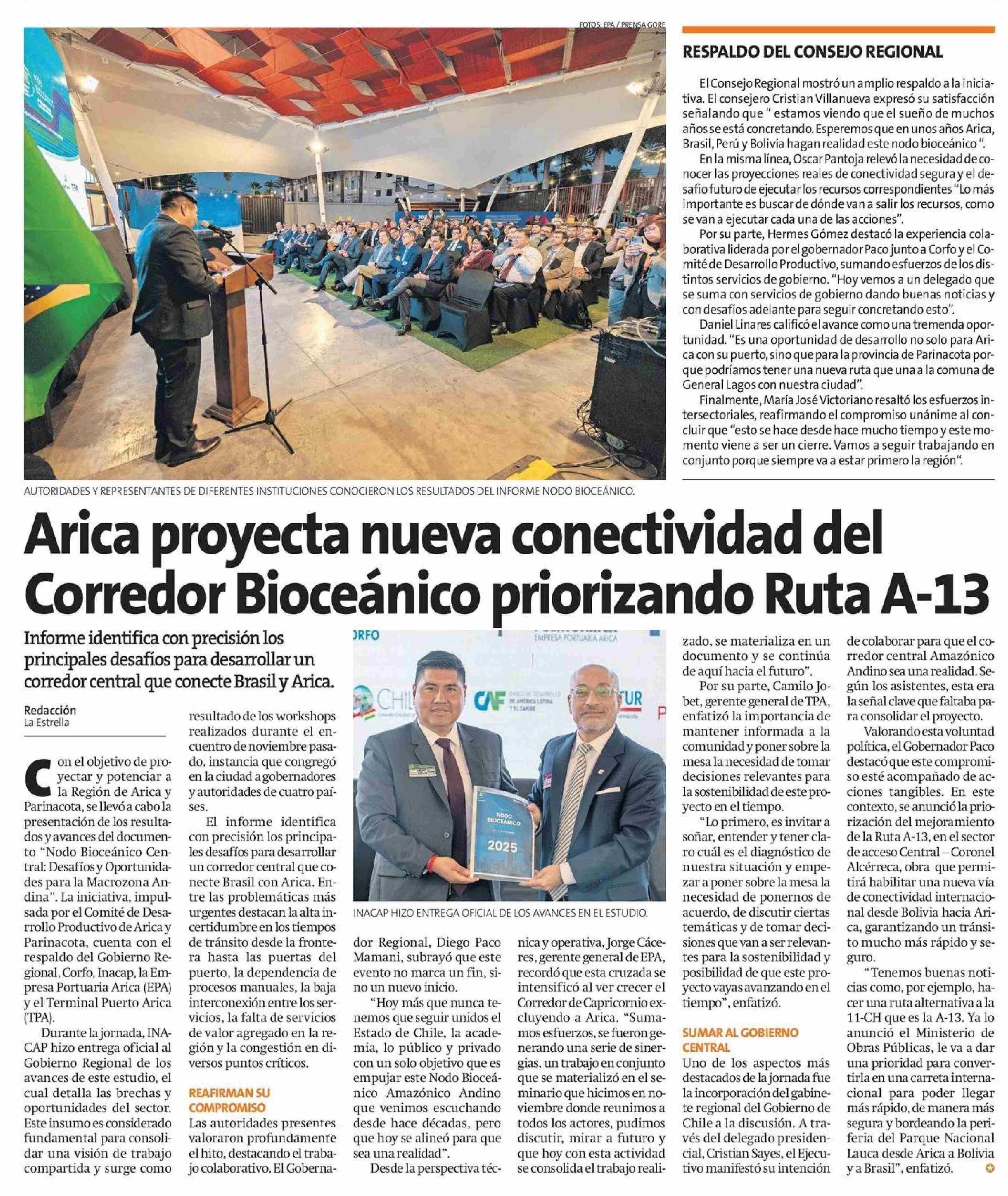 Título: Arica proyecta nueva conectividad del Corredor Bioceánico priorizando Ruta A-13
