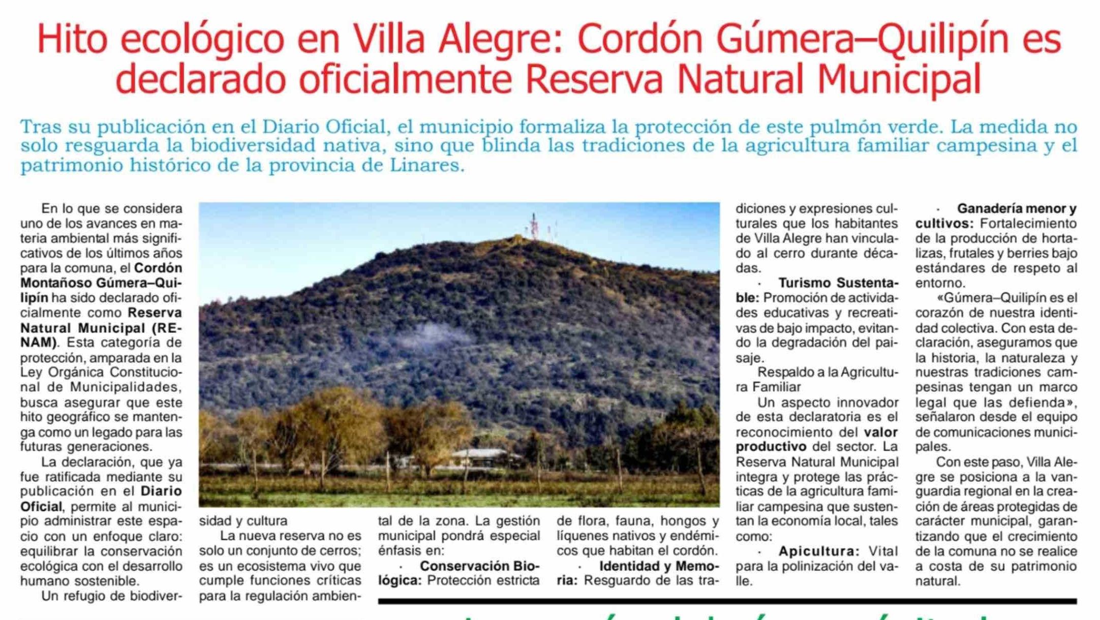 Título: Hito ecológico en Villa Alegre: Cordón Gúmera-Quilipín es declarado oficialmente Reserva Natural Municipal