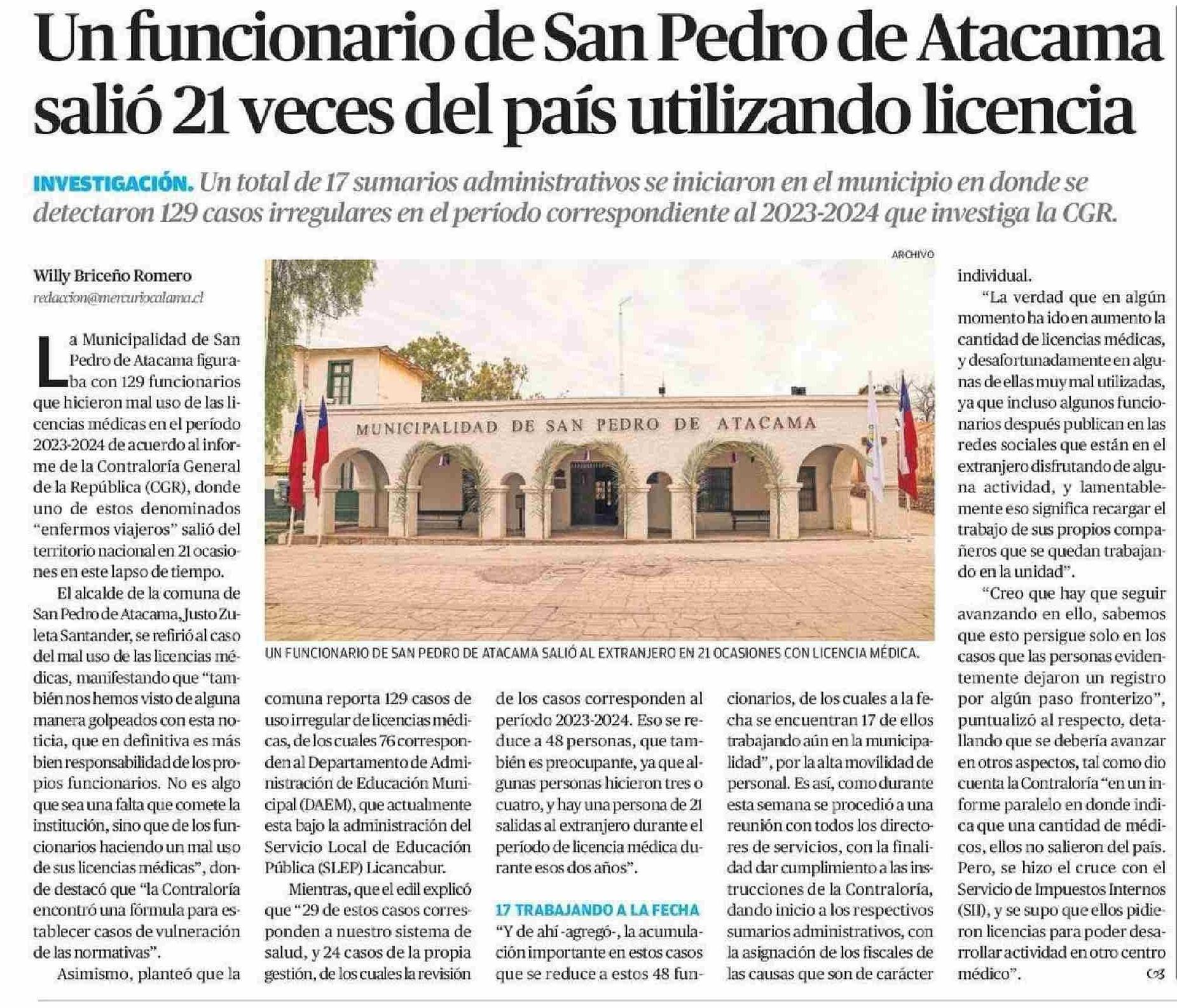 Un funcionario de San Pedro de Atacama salió 21 veces del país utilizando licencia 29-05-2025 El Mercurio de Antofagasta |