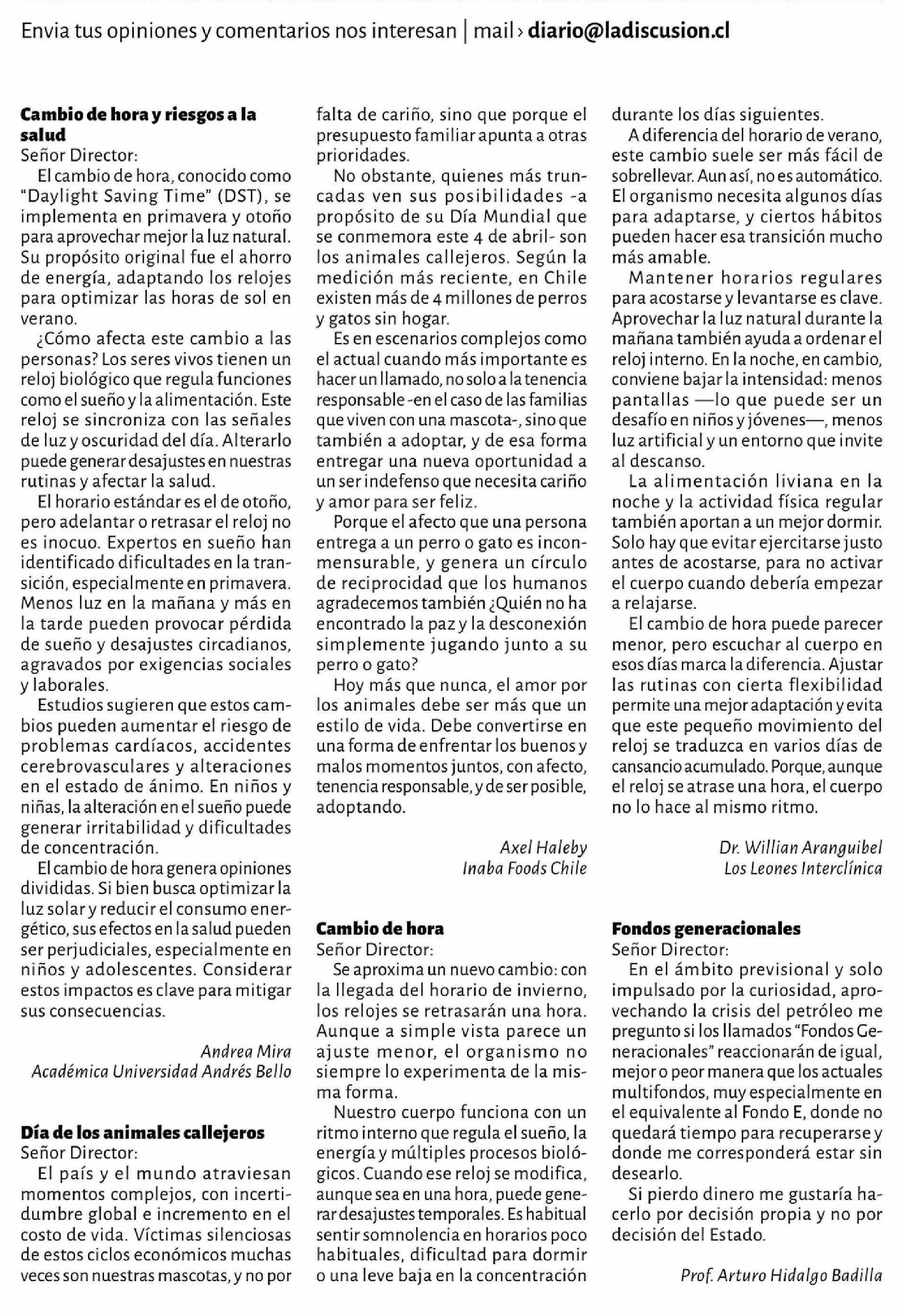 Cartas: Cambio de hora y riesgos a la salud Señor Director: El cambio de hora, conocido como "Daylight Saving Time" (DST), se implementa en primavera y otoño para aprovechar mejor la luz natural. Su propósito original fue el ahorro de energía, adaptando los relojes para optimizar las horas de sol en
