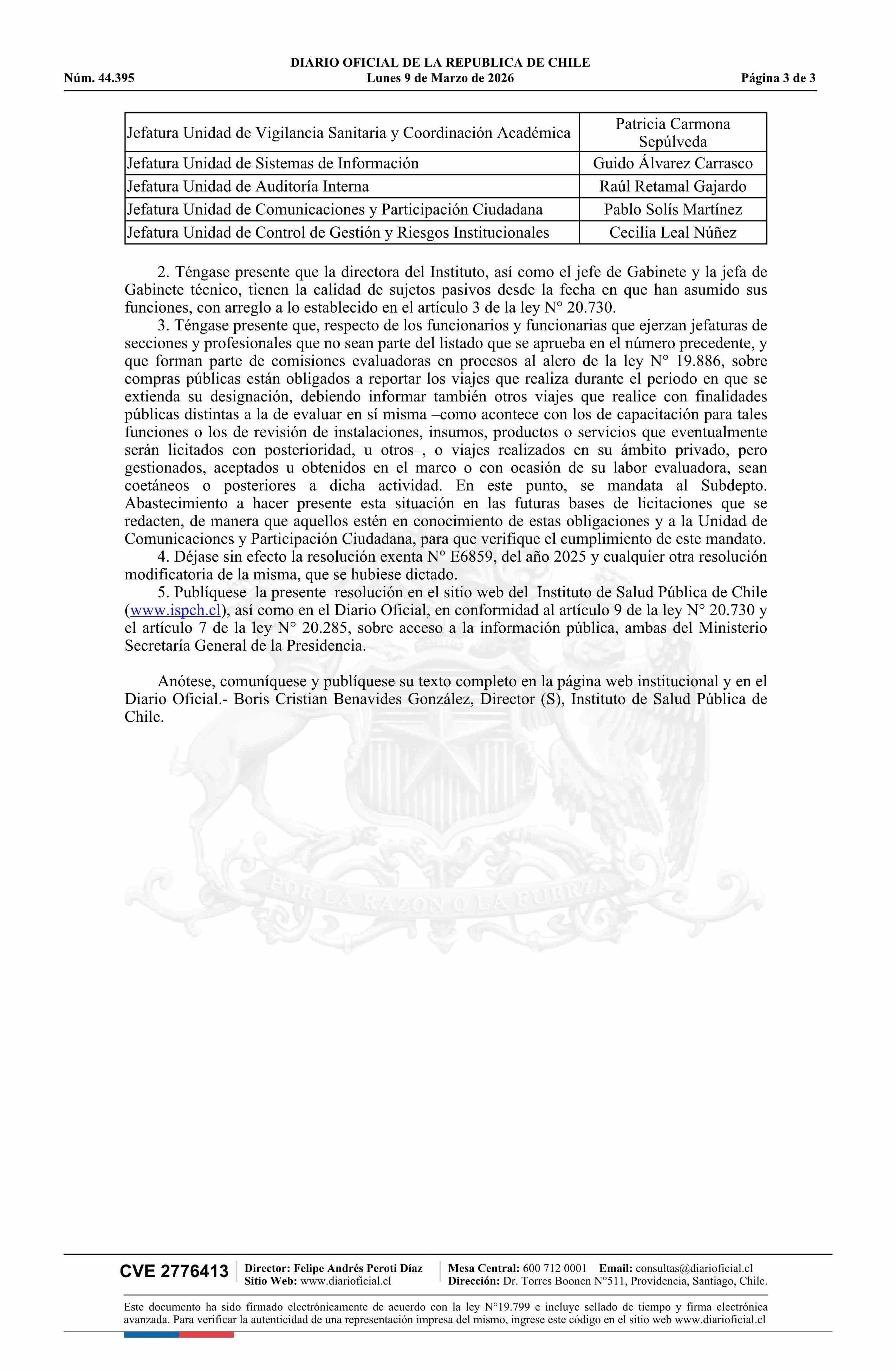 Resolución exenta número E 675, de 2026.- Actualiza listado de sujetos pasivos del Instituto de Salud Pública de Chile y deja sin efecto resolución N° E6859 exenta de 2025 09-03-2026 Diario Oficial Edición Electrónica |