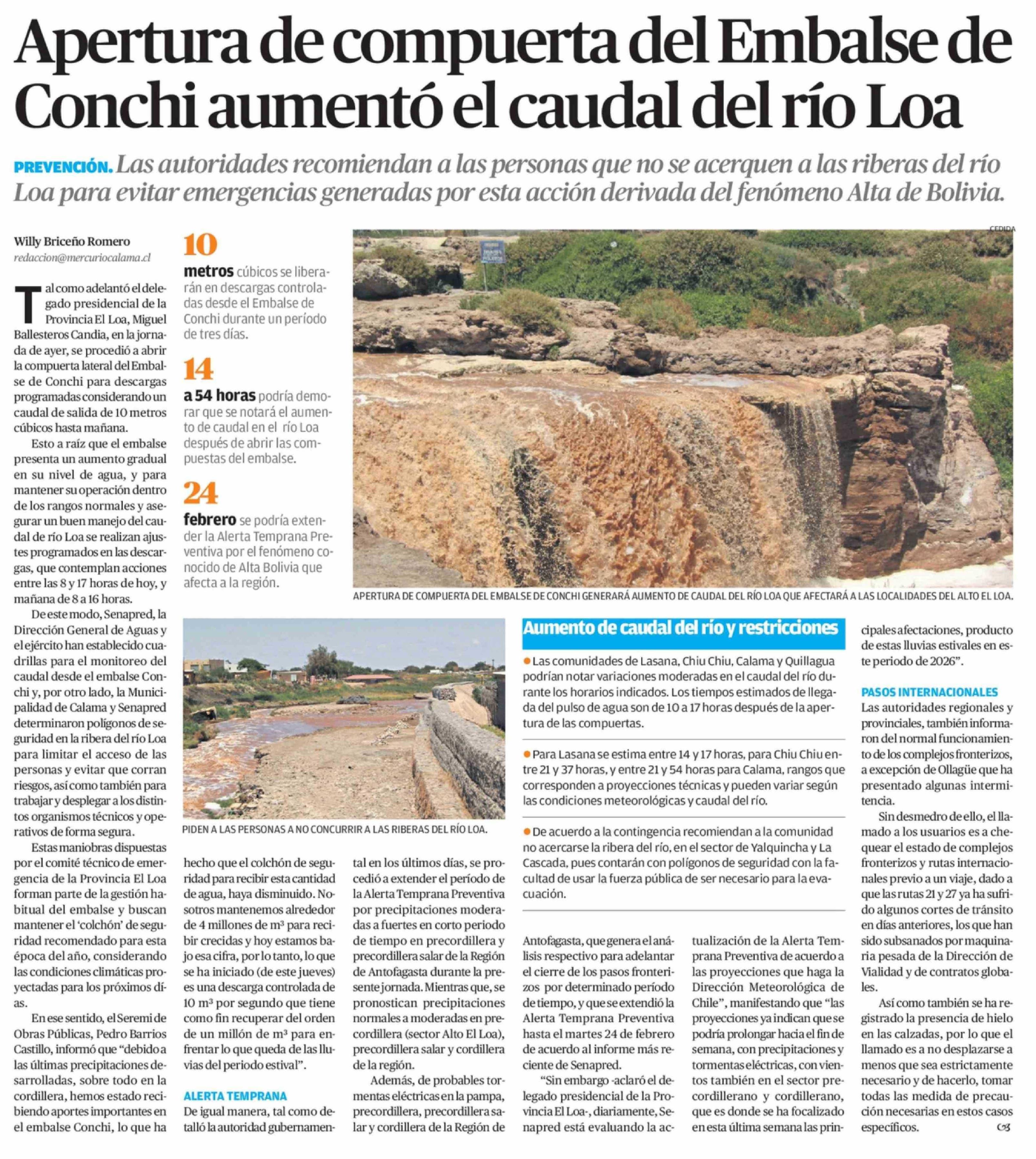 Apertura de compuerta del Embalse de Conchi aumentó el caudal del río Loa 20-02-2026 El Mercurio de Antofagasta |