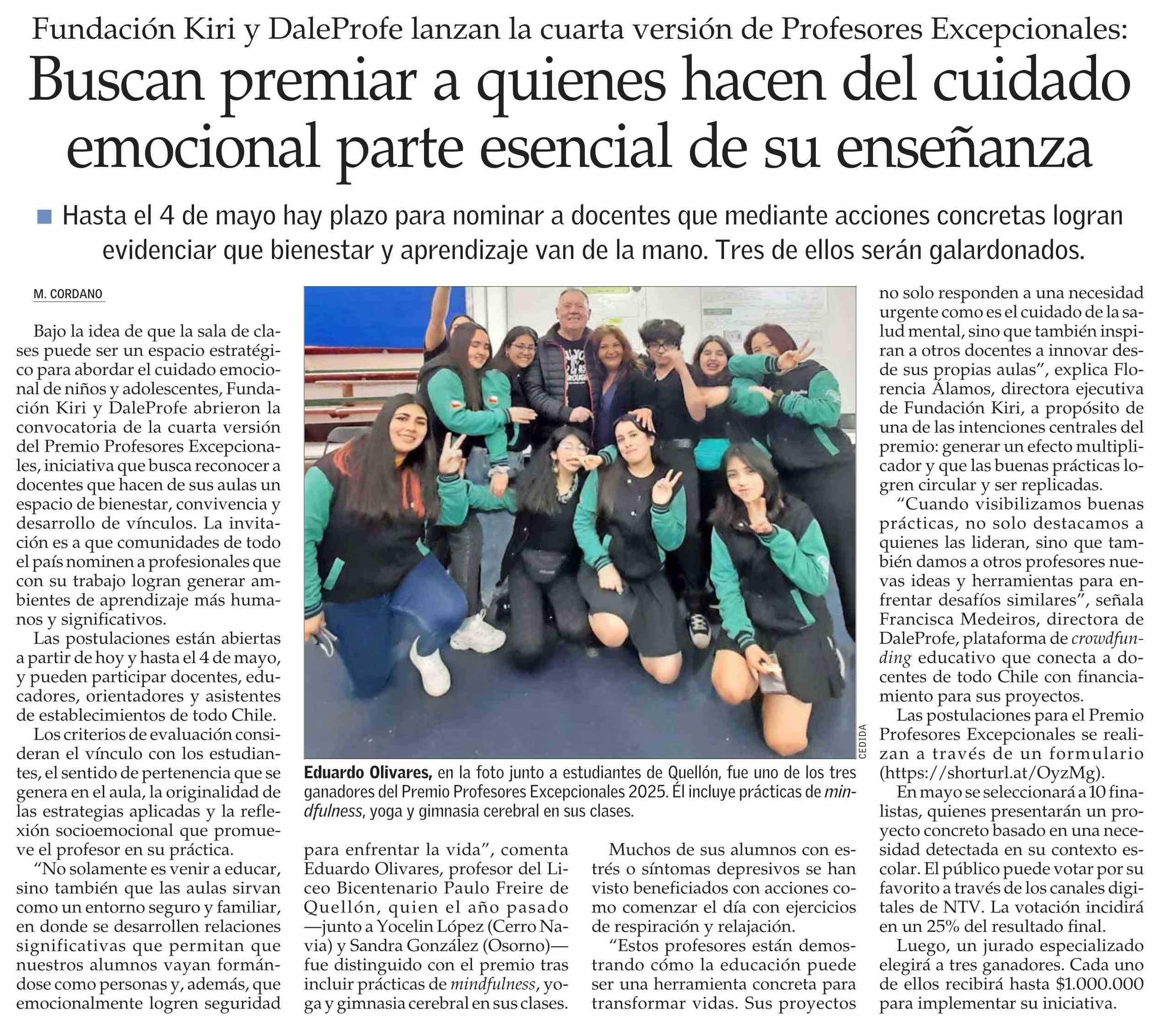 Buscan premiar a quienes hacen del cuidado emocional parte esencial de su enseñanza 13-04-2026 El Mercurio |