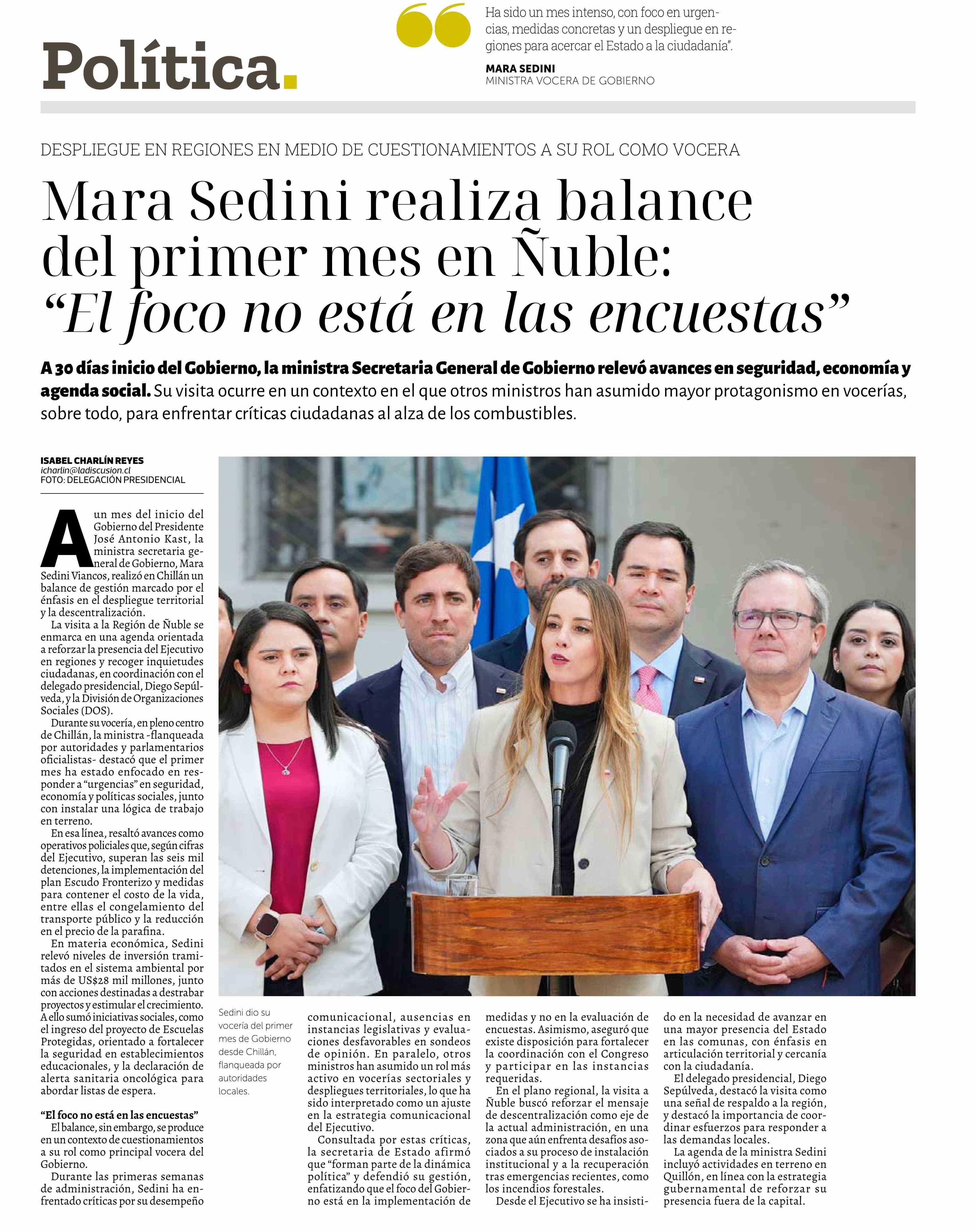 Mara Sedini realiza balance del primer mes en Xuble: “El foco no está en las encuestas” 11-04-2026 La Discusión |