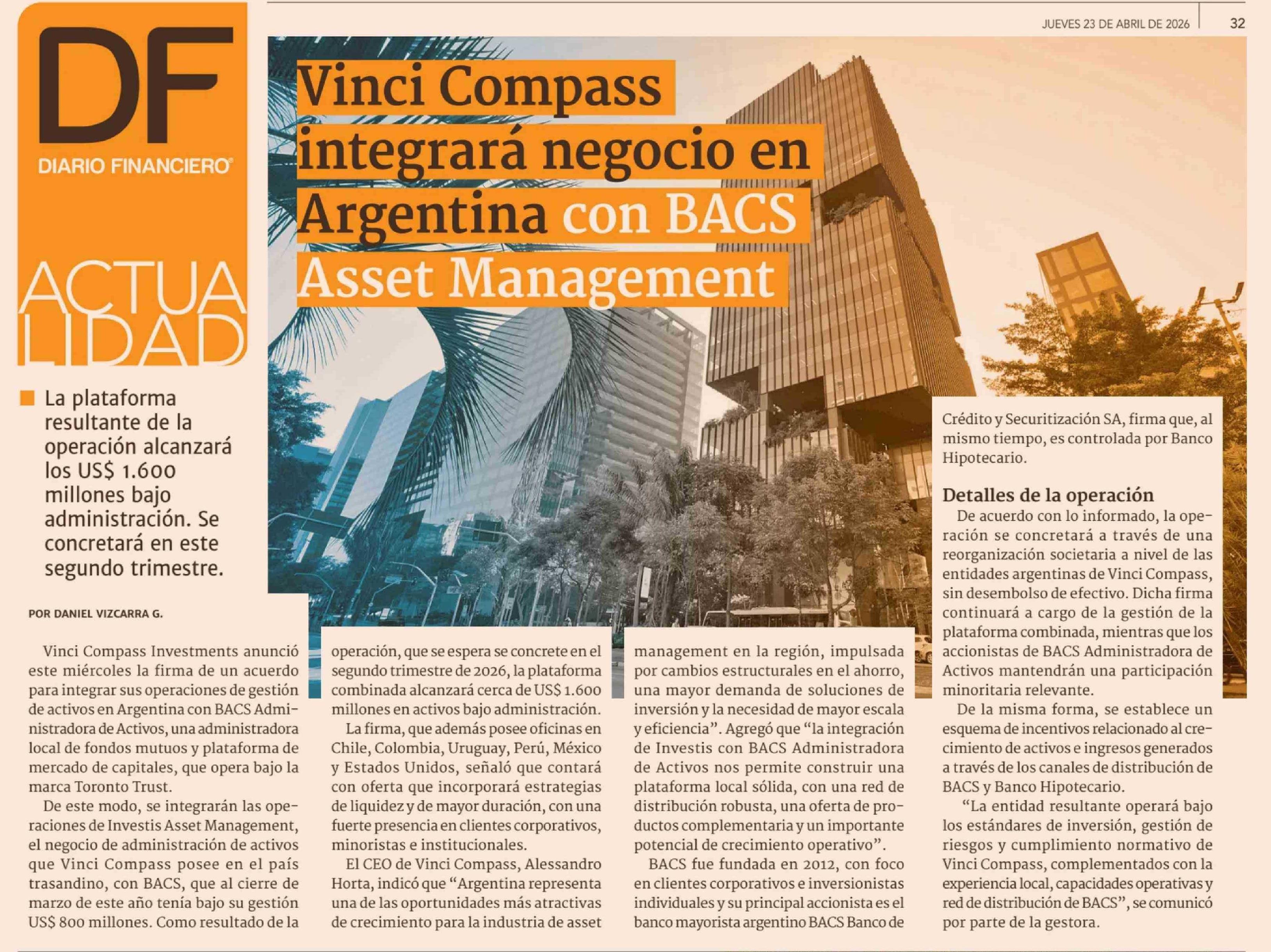 Vinci Compass integrará negocio en Argentina con BACS Asset Management 23-04-2026 Diario Financiero |