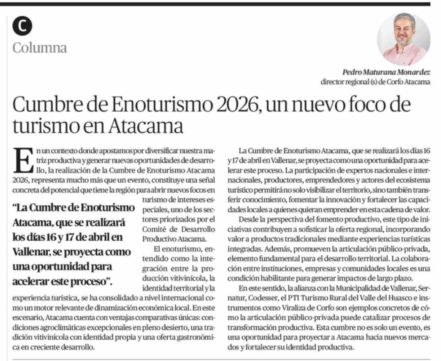 Columnas de Opinión: Cumbre de Enoturismo 2026, un nuevo foco de turismo en Atacama 21-03-2026 El Diario de Atacama |