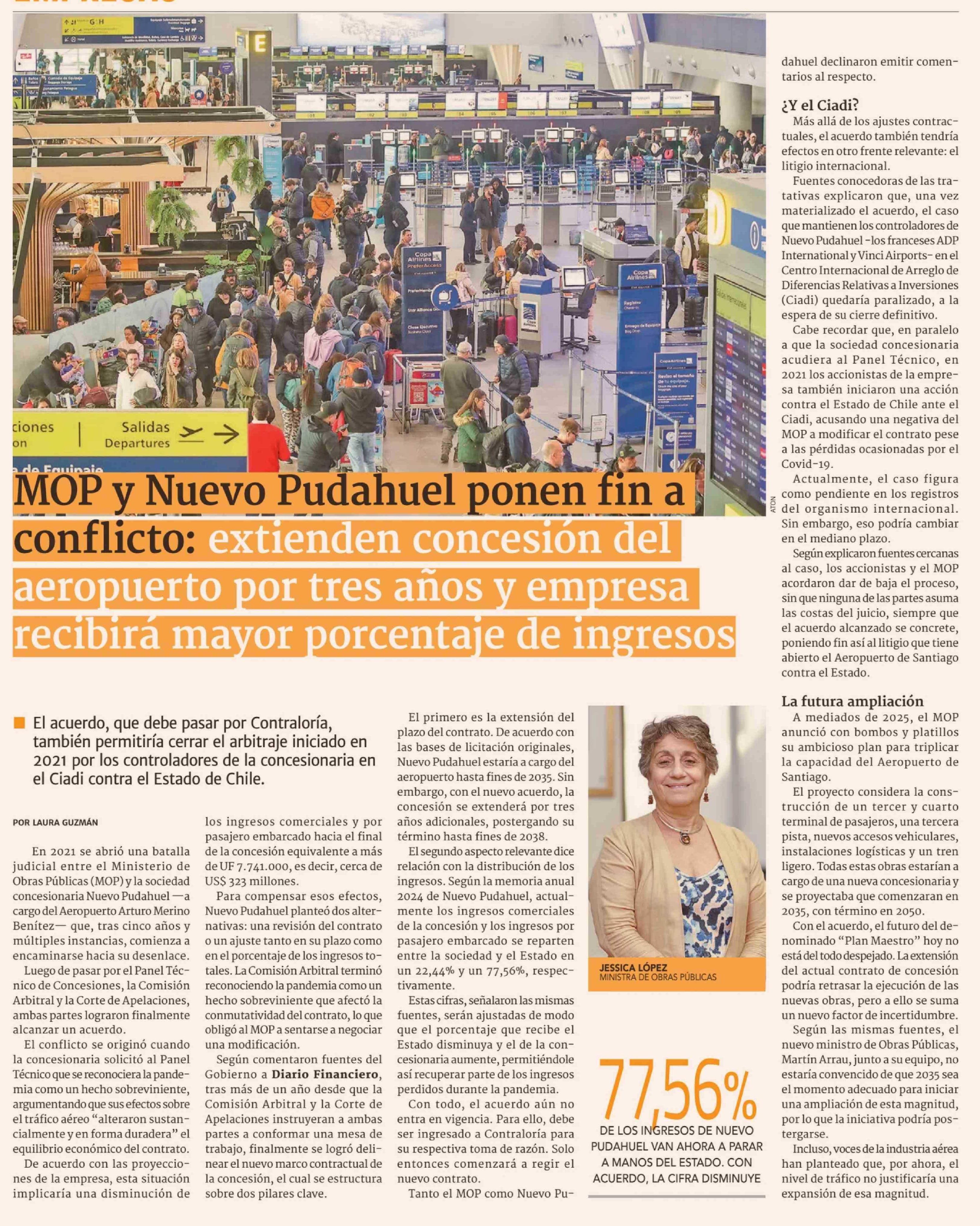 Título: MOP y Nuevo Pudahuel ponen fin a conflicto: extienden concesión del aeropuerto por tres años y empresa recibirá mayor porcentaje de ingresos