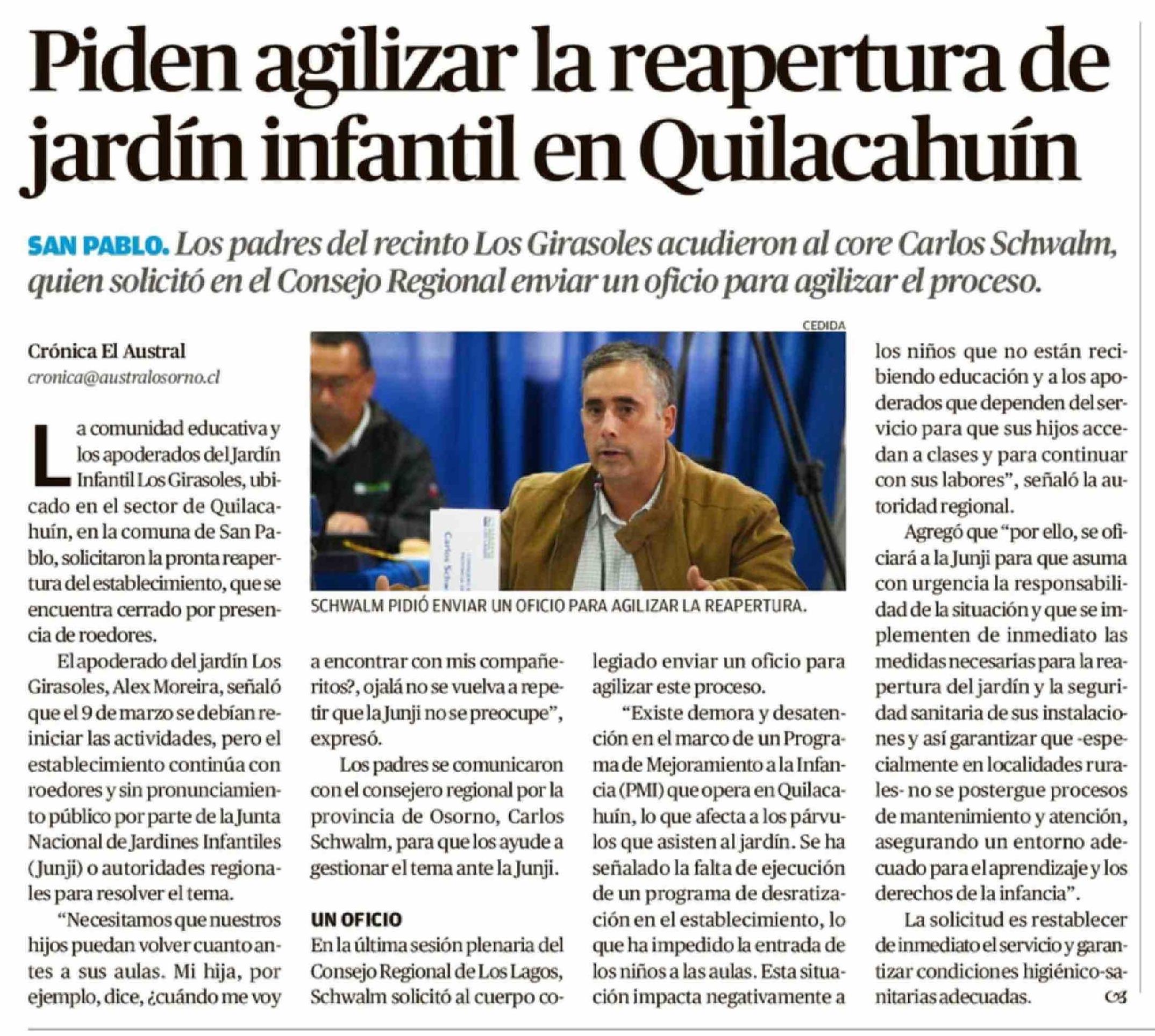 Piden agilizar la reapertura de jardín infantil en Quilacahuín 22-03-2026 El Austral de Osorno |