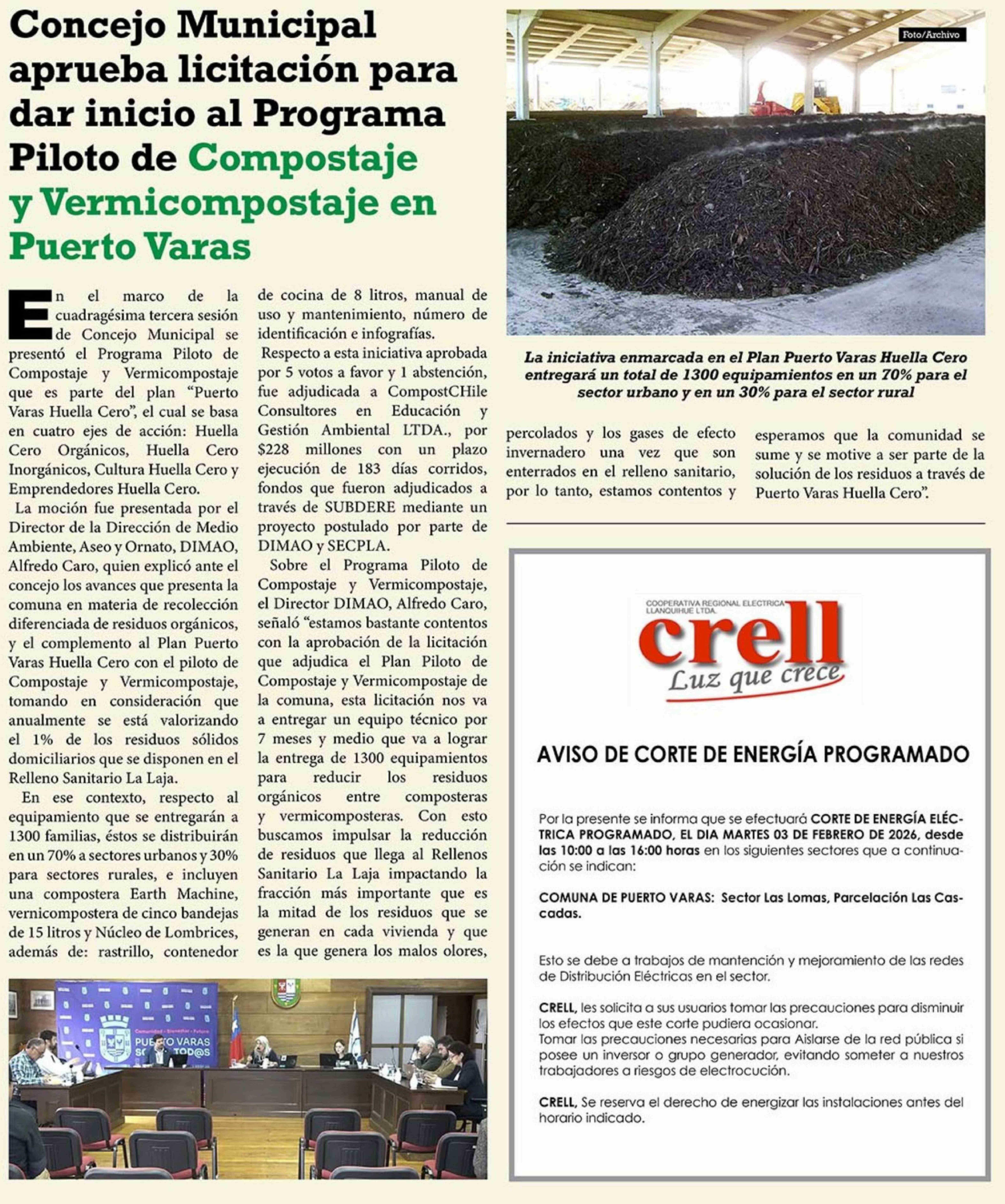 Concejo Municipal aprueba licitación para dar inicio al Programa Piloto de Compostaje y Vermicompostaje en Puerto Varas 03-02-2026 El Heraldo Austral |