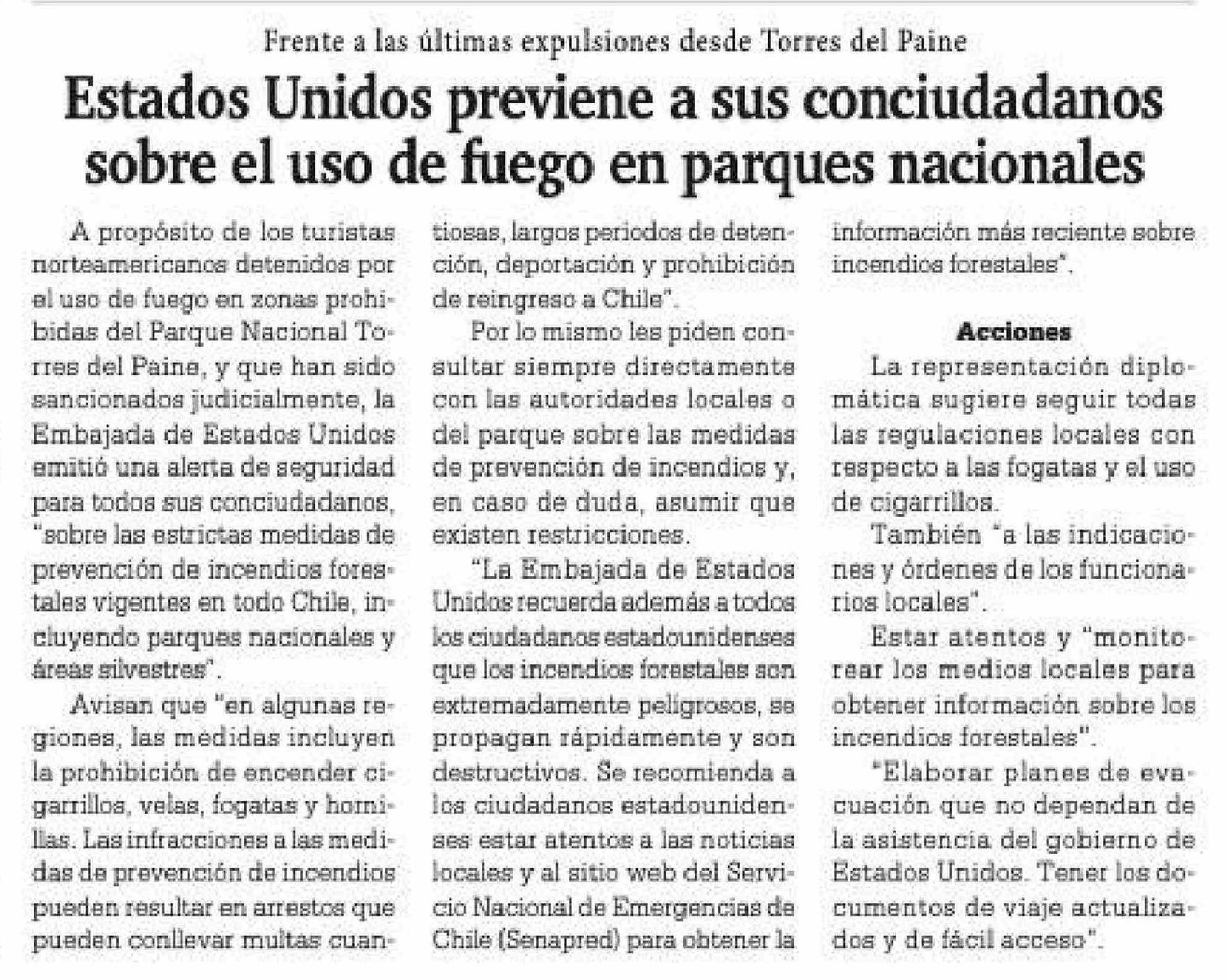 Estados Unidos previene a sus conciudadanos sobre el uso de fuego en parques nacionales 27-02-2026 La Prensa Austral |