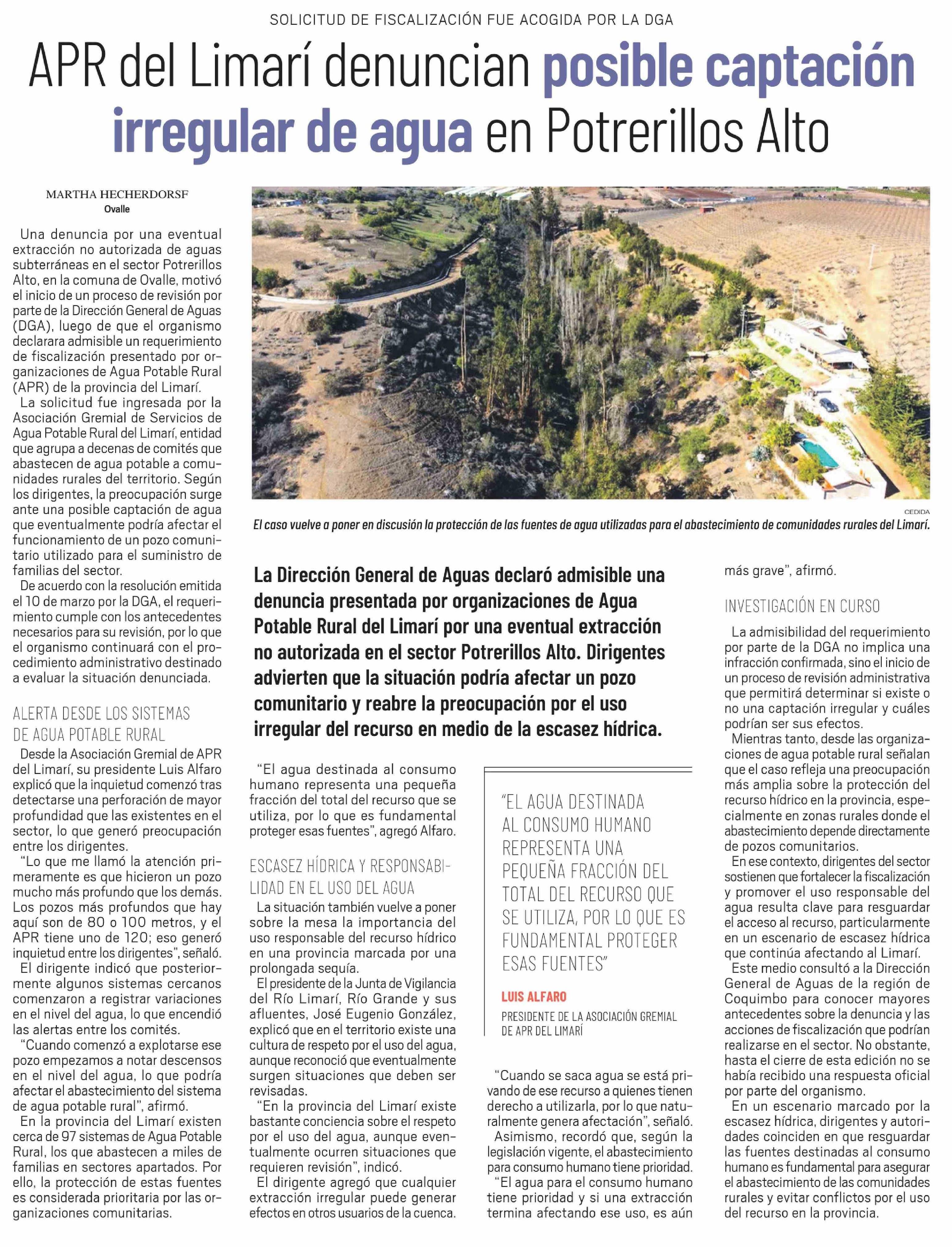 APR del Limarí denuncian posible captación irregular de agua en Potrerillos Alto 17-03-2026 El Ovallino |