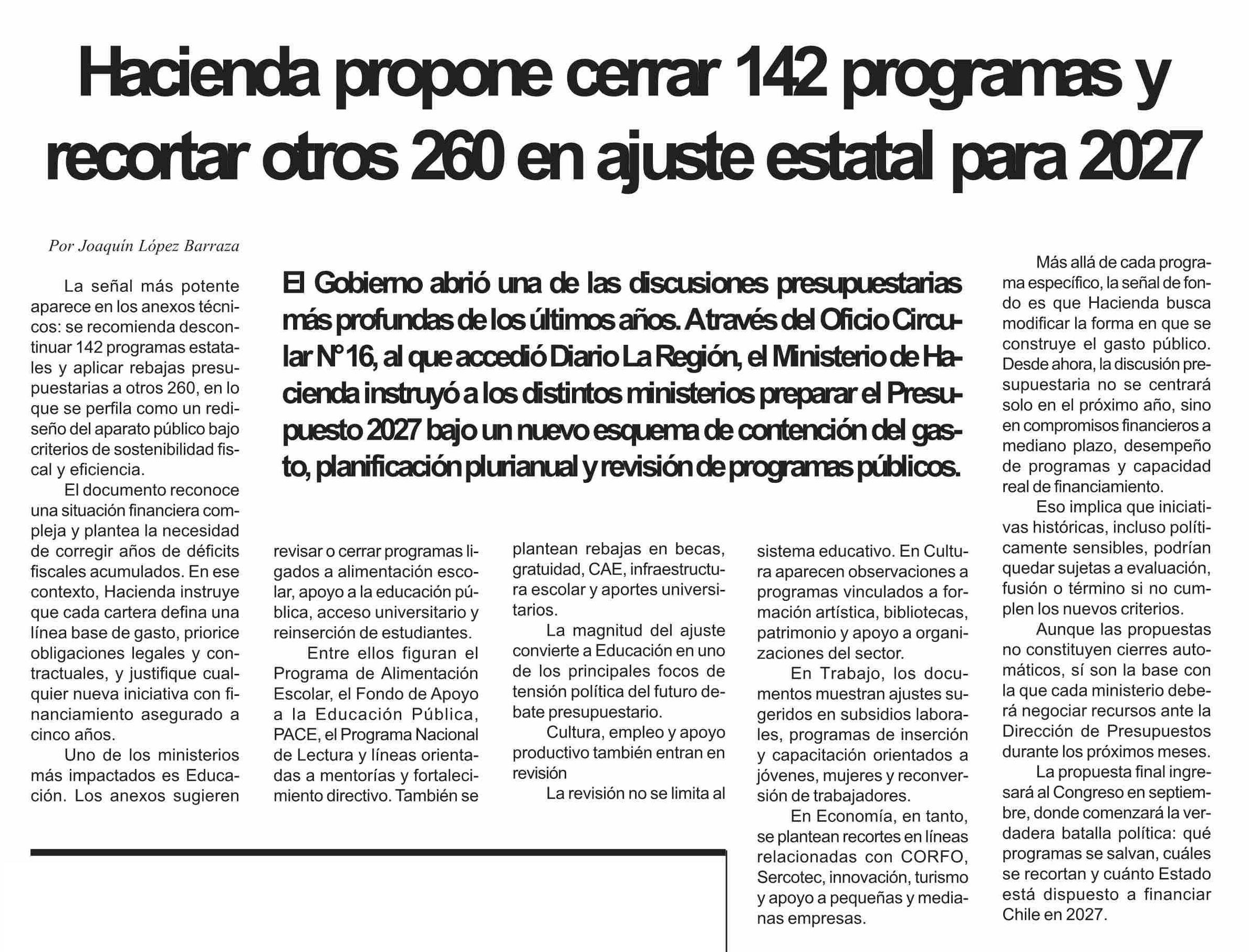 Hacienda propone cerrar 142 programas y recortar otros 260 en ajuste estatal para 2027 26-04-2026 Diario la Región |