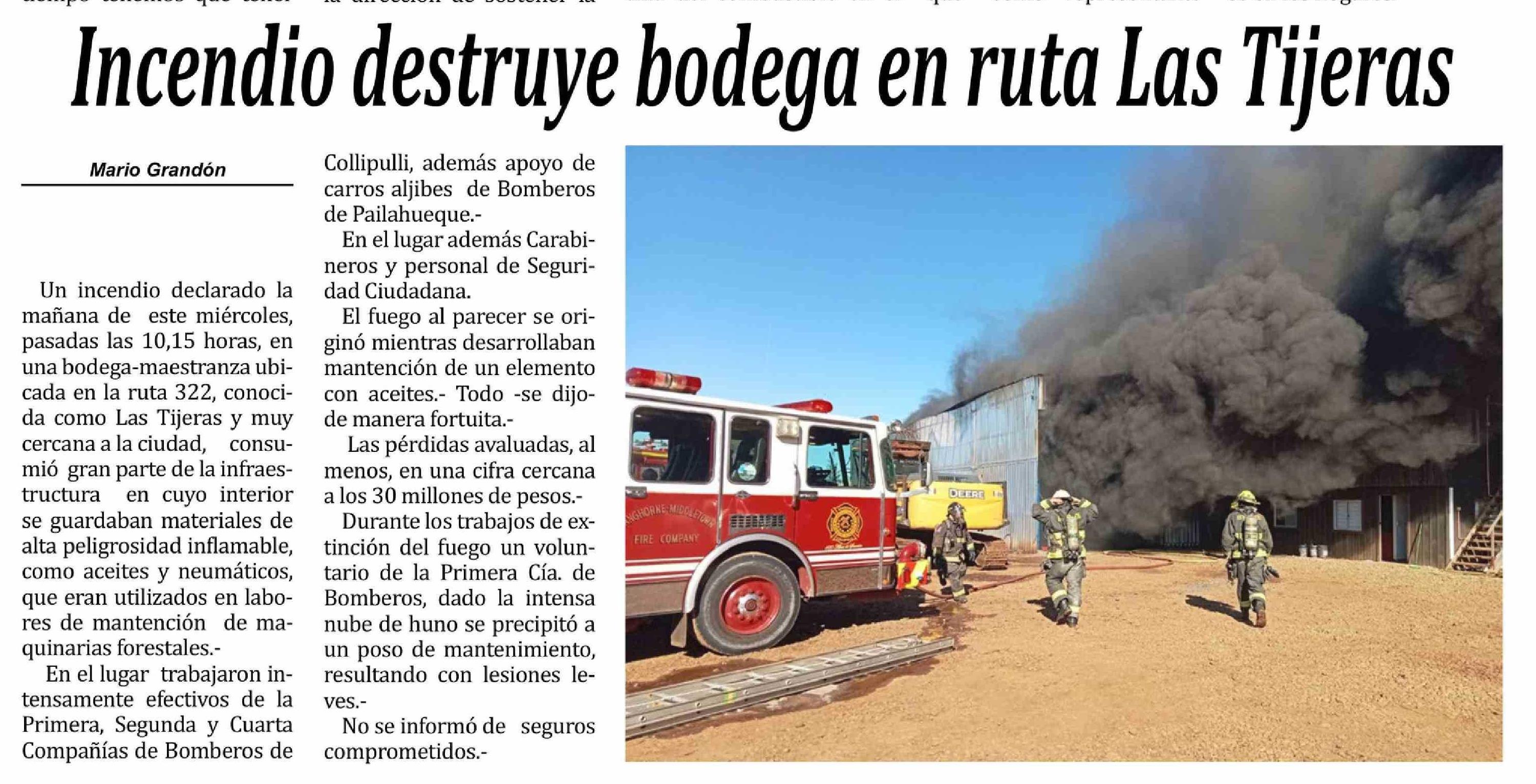 | Título: | Incendio destruye bodega en ruta Las Tijeras |