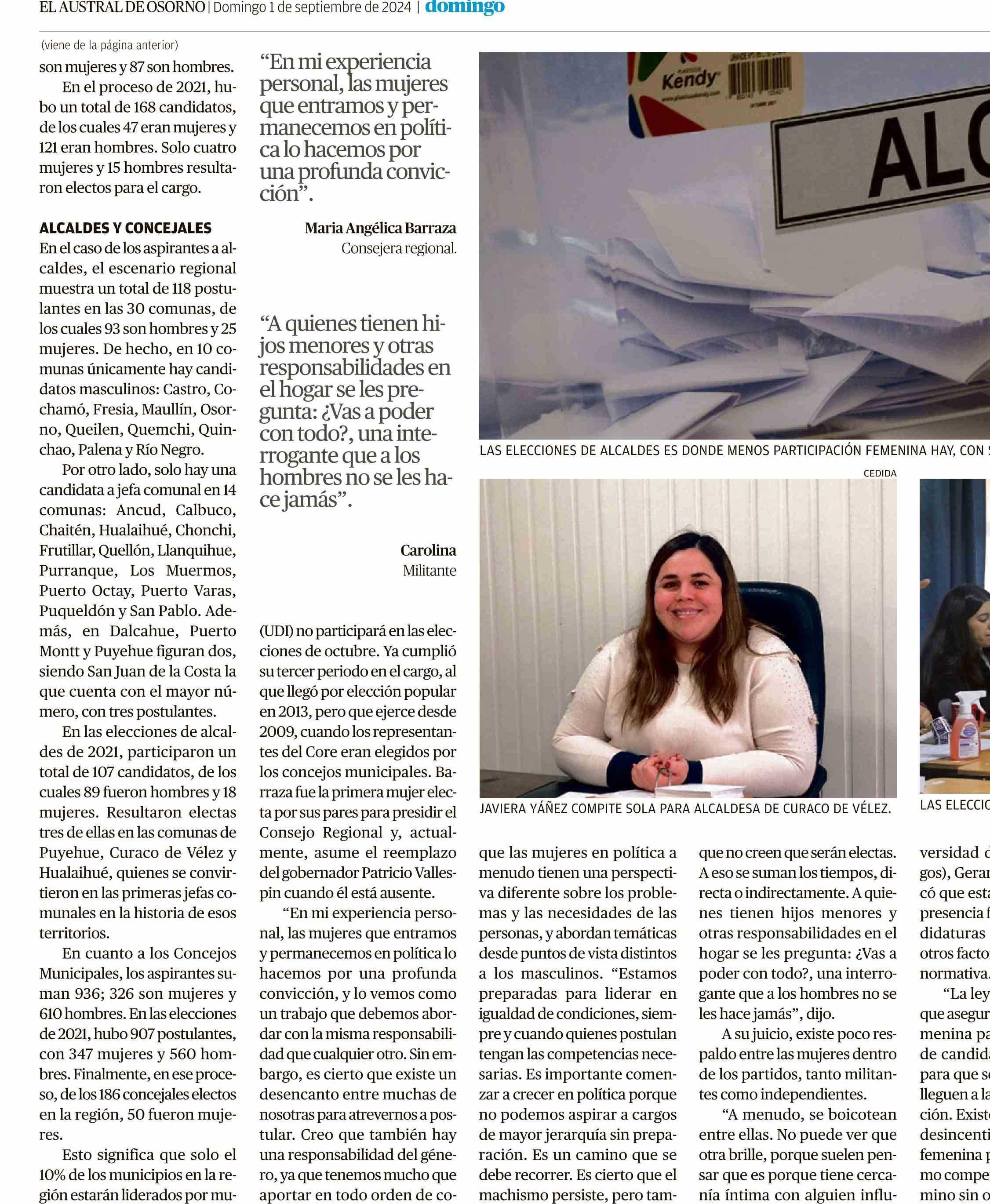 Participación femenina en la región: 33% de candidatos a las elecciones son mujeres 01-09-2024 El Austral de Osorno |