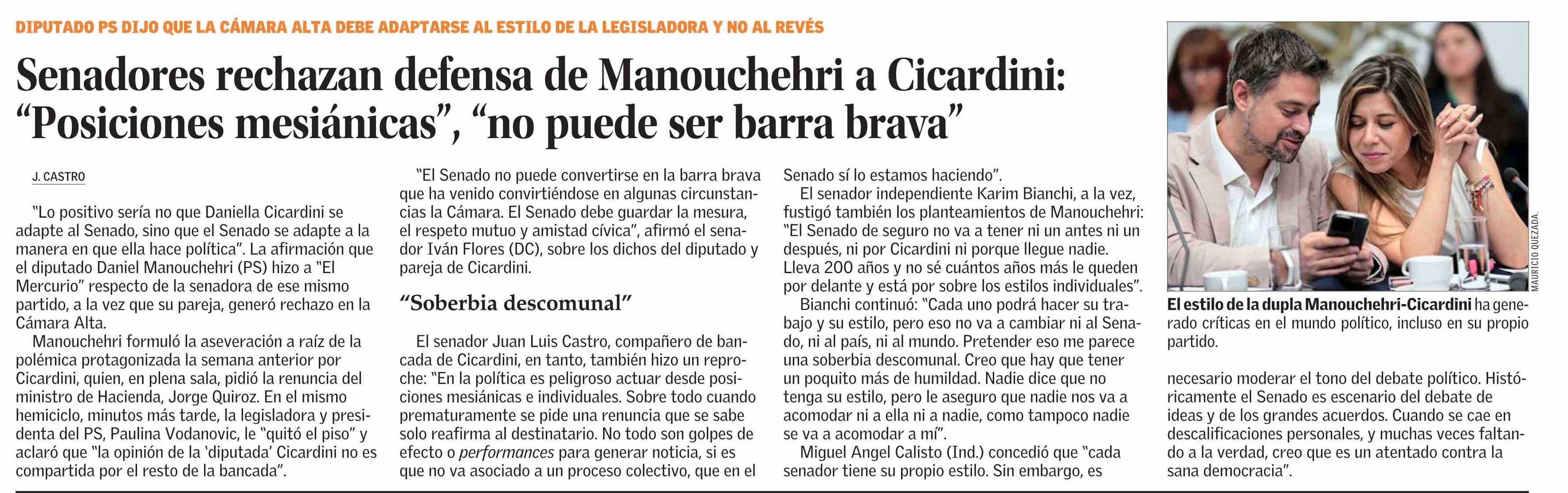 Senadores rechazan defensa de Manouchehri a Cicardini: “Posiciones mesiánicas”, “no puede ser barra brava” 30-03-2026 El Mercurio |